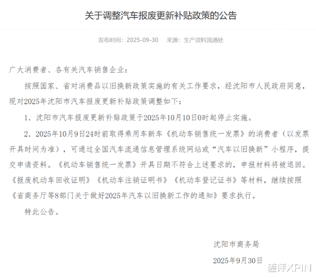 也几乎是前后脚的功夫,沈阳宣布报废补贴在10月10日下线。脖子哥翻了一下,它应该算是全国主要城市里,第一个明确停止报废的。