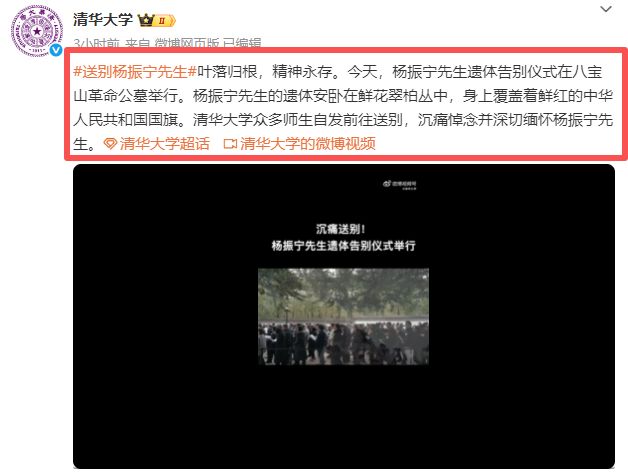 清华大学发布了最终的道别视频,告知大家杨振宁先生的遗体告别仪式是早上9点举行的,随后遗体就葬在了八宝山,家人给他选得墓地同样是鲜花翠柏之中,希望他能继续看着盛世繁华欣慰而笑。