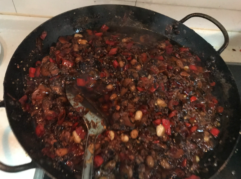 三、飘香酱制作1.配料:泡椒500g、芝麻酱150g、花生酱200g、辣椒油40g、大蒜仁100g、花椒粉30g、味精80g、超级鲜味王l0g、鸡精100g、白糖20g、精盐40g。