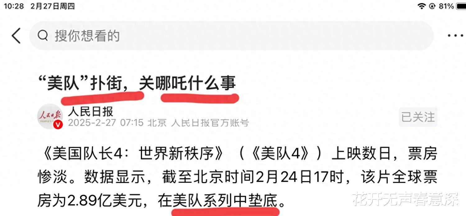 “美队扑街”,关哪吒什么事!如果熟悉人民日报的朋友,真的是第一次看到这次官方媒体这次真的是火大了啊,尤其是用了粤语当中“扑街”这两个字,相信广东的朋友都知道这两个字到底有多大的杀伤力。美队4票房的扑街跟哪吒2有关系吗,本来就是不同领域,不同题材的作品,根本就没有任何的可比性,为什么美队4的票房差呢,人民日报说了在全球范围内,美队4的票房相比之前漫威系列的作品都要差,截止到目前,美队4全球的票房也才不到3亿美元,而在我们国内也贡献了1亿多人民币的票房,可以说已经没全球很多地方的票房都要高了,所以外媒这样的说法和报道真的是无理取闹啊。