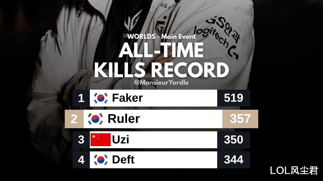 第三轮瑞士轮结束之后,拳头更新了全球总决赛,正赛击杀榜单,Faker依旧是断崖式领先,总击杀数,目前已经来到519了,而原本排第二的Uzi,被Ruler反超,下降到第三名,尺帝现在成了Faker之下的历史第二人,排在第四的还是Deft,乌兹都退役这么久了,还在前三,确实很能杀啊。