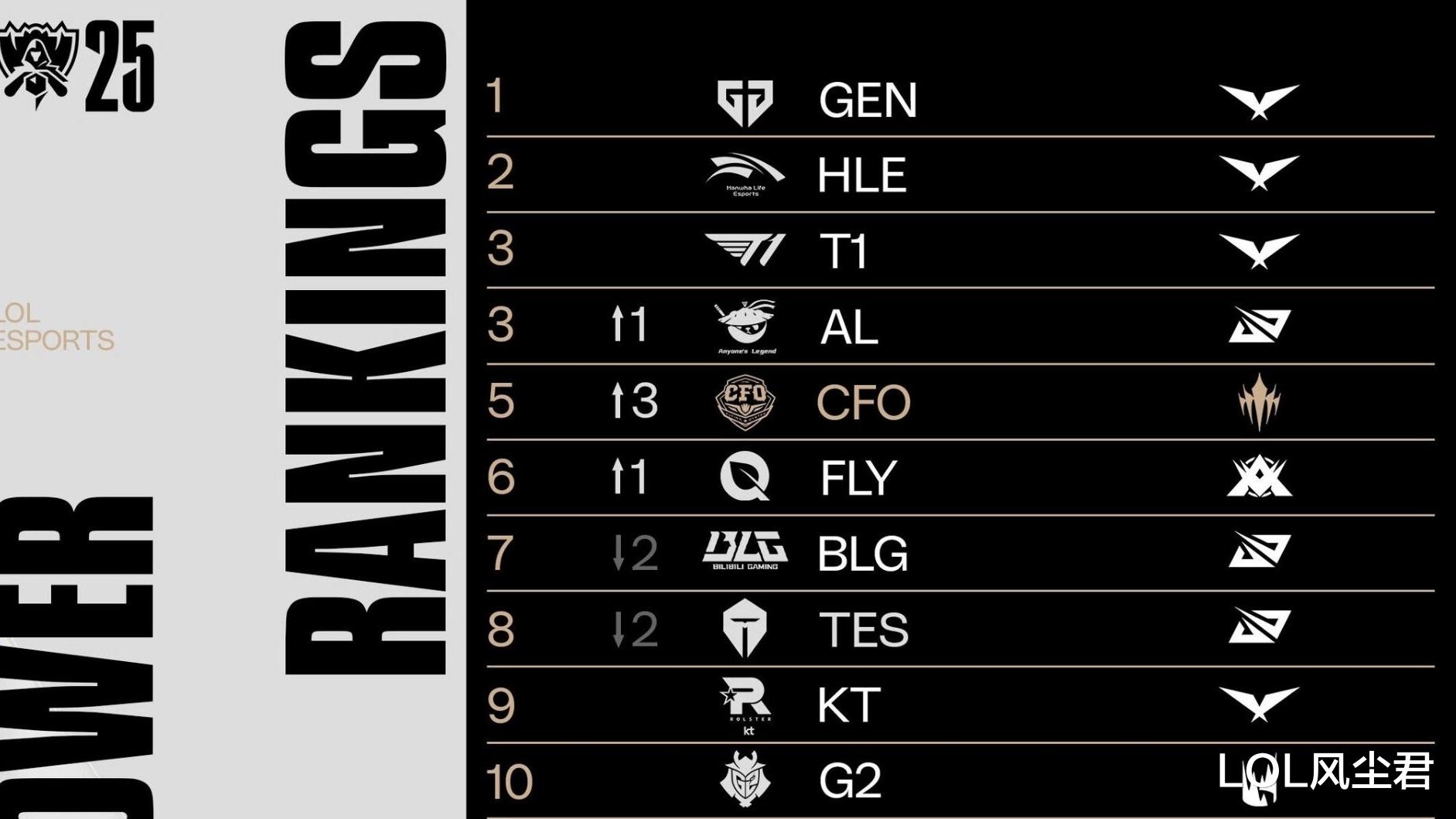 英雄联盟S15全球总决赛,瑞士轮前三轮结束之后,LOL官方重新评估了,各大参赛战队的实力,新的战力榜单,前三依旧LCK被包揽,不过AL和T1是并列第三的,原本排在第4-5名的滔搏和BLG,被降至第7-8名,CFO连跳三级挤进前5,FLY上涨到第6名,剩下的队伍,没有太大的变动。