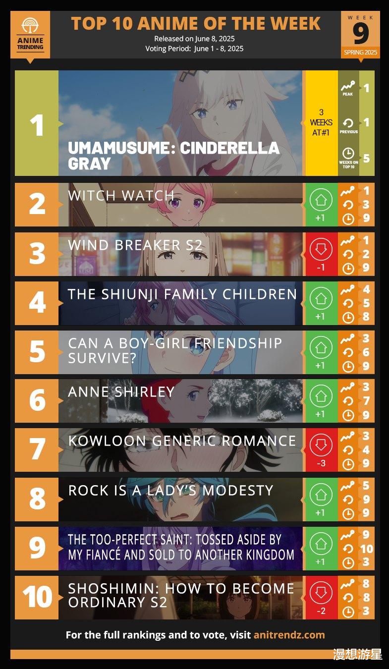 最后是本周三大将,第三名,《防风少年》第二季;第二名,《魔女与使魔》;第一名,《赛马娘 芦毛灰姑娘》。