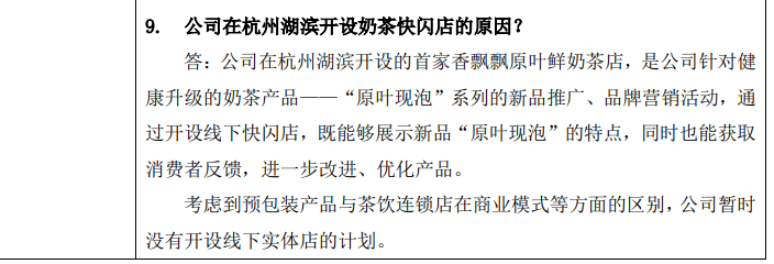 在去年开出杭州快闪店后,香飘飘曾如此回复关于未来是否会入局线下茶饮的问题:公司暂时没有开设线下茶饮店的计划,希望更专注于自身的优势领域,当下还是聚焦在预包装产品的研发、销售上。