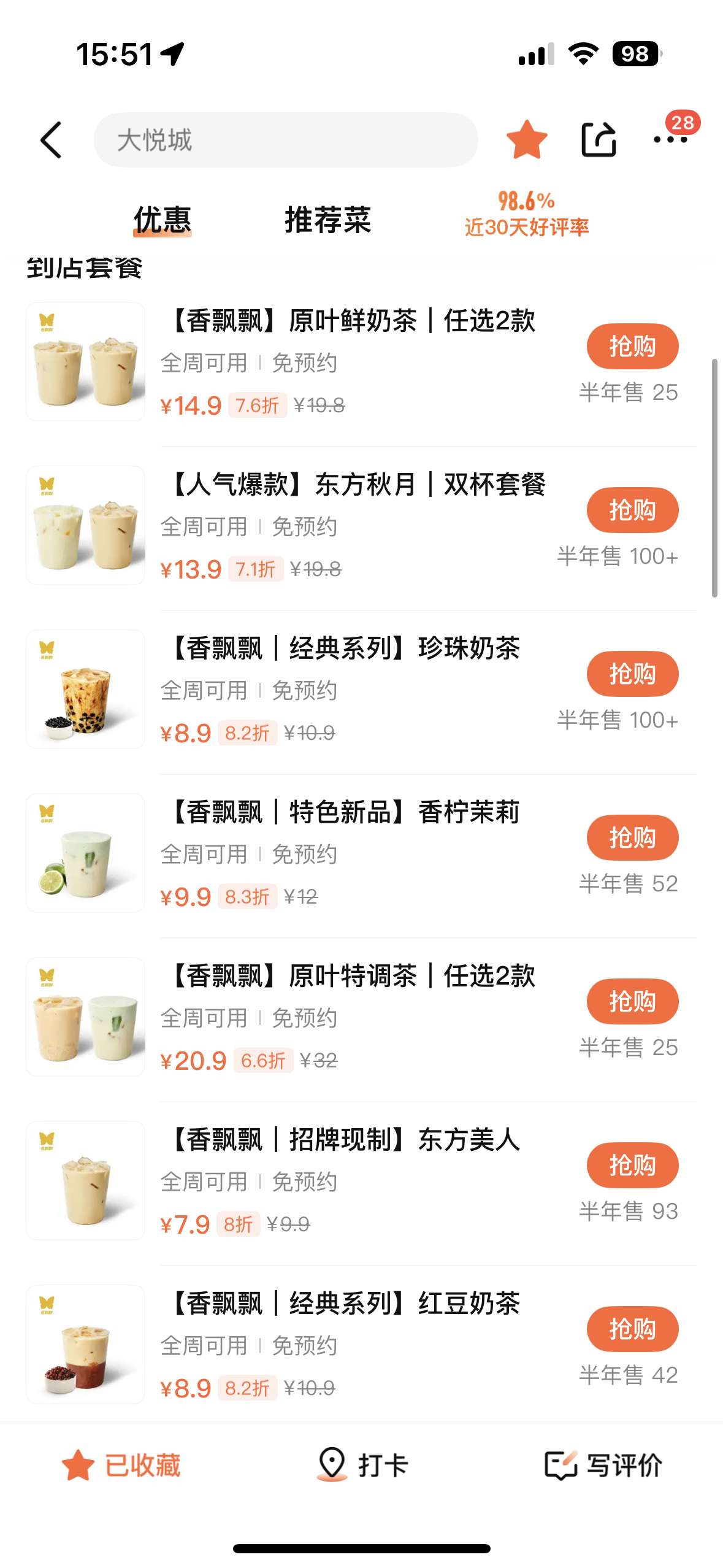 营销层面,门店靠近商场主道路一侧,有1-2名工作人员拿着“大众点评收藏打卡领好礼”的牌子,不断引导过路人群以及正在排队的顾客。另外,门店开业前三天全场饮品八折,大众点评也有大量的优惠活动,如原价9.9元的东方美人和秋月白13.9元两杯,单杯6.95元,降价幅度近30%。