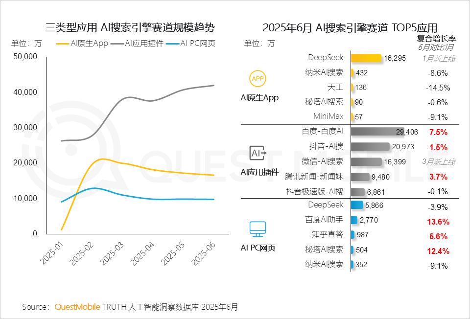 赛道规模数据更显眼的是 AI 插件,因为原生 App 被越来越多的传统 App 以接入 DeepSeek 的形式分流,所以从数据上,AI 插件的规模增长趋势高于 AI 原生 App 和 AI PC 网页两种应用类型。从 AI 应用插件的规模上看,百度 AI、抖音 AI 搜和微信 AI 搜,分别占据前三强的位置。