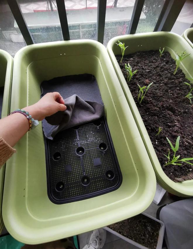 种完后第一次浇水要浇透,以后浇水时,就往中间的矿泉水瓶里浇,水会从瓶身的小孔缓慢渗出,这样浇得比较均匀。