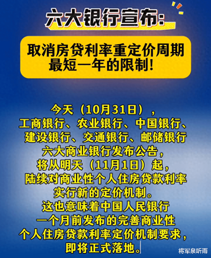 关于房贷利率重定价周期的调整机制,首先是中国银行、建设银行、农业银行、工商银行、交通银行和邮政储蓄银行,发出了通告。