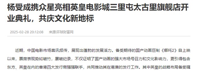 当时就有不少人很是看好英皇,而他在内地的事业版图也是有扩大了一步,而在今年《哪吒2》的爆火,更是展现了中国电影市场的活力和巨大收益,很快英皇在太古里开的电影城正式开业,开业典礼当天,更是有不少大佬都来给英皇站台啊,其中成龙更是抢眼的很,那么都有哪些大佬来助阵了呢?