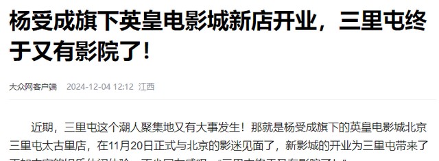 英皇作为香港鼎鼎有名的公司,在香港的的地位也是首屈一指的,而他自然也不会放过在大陆内地发展的机会,在去年的时候,英皇就着手准备着进军内地市场了,在北京三里屯开了一家新影城。