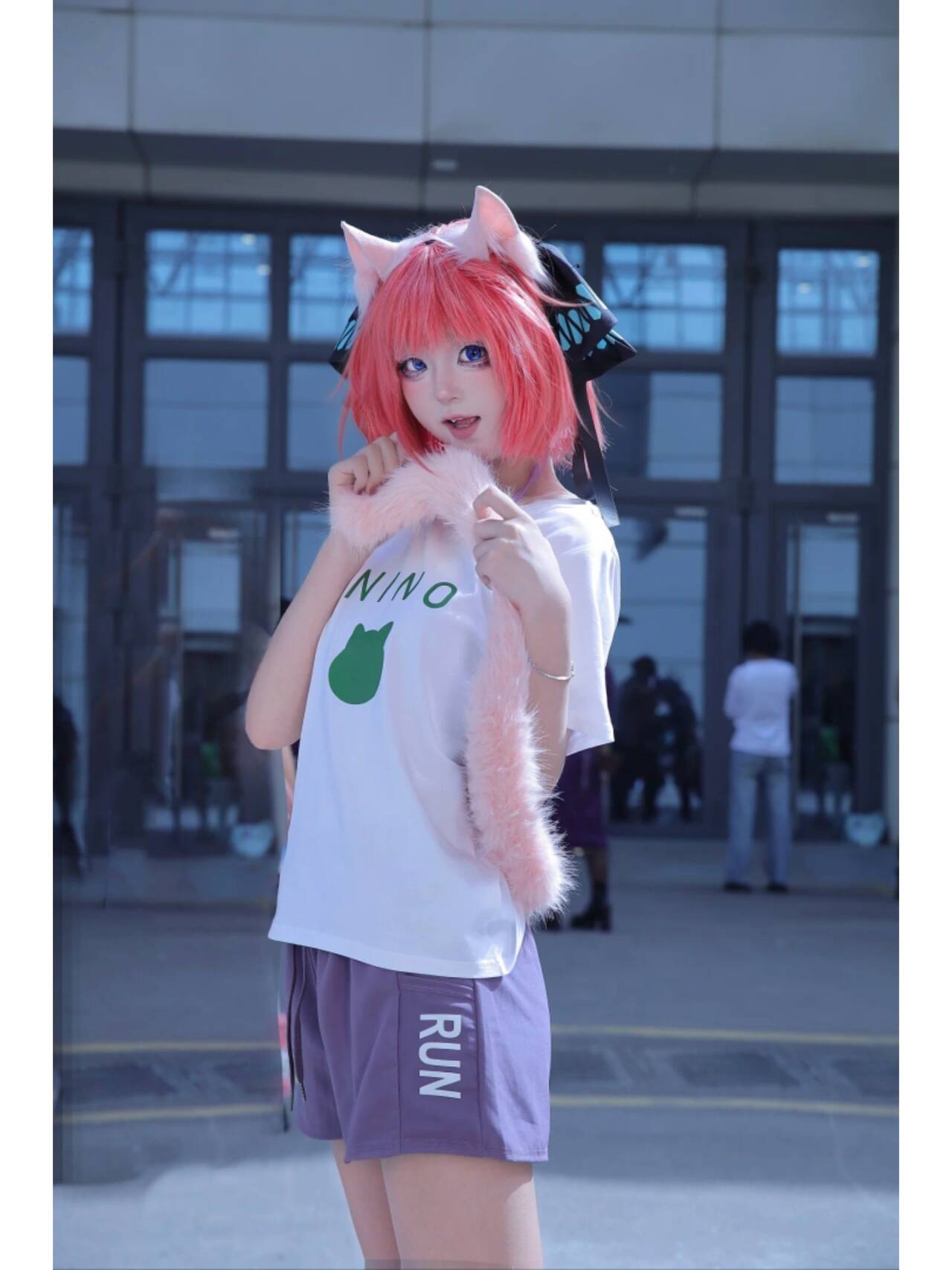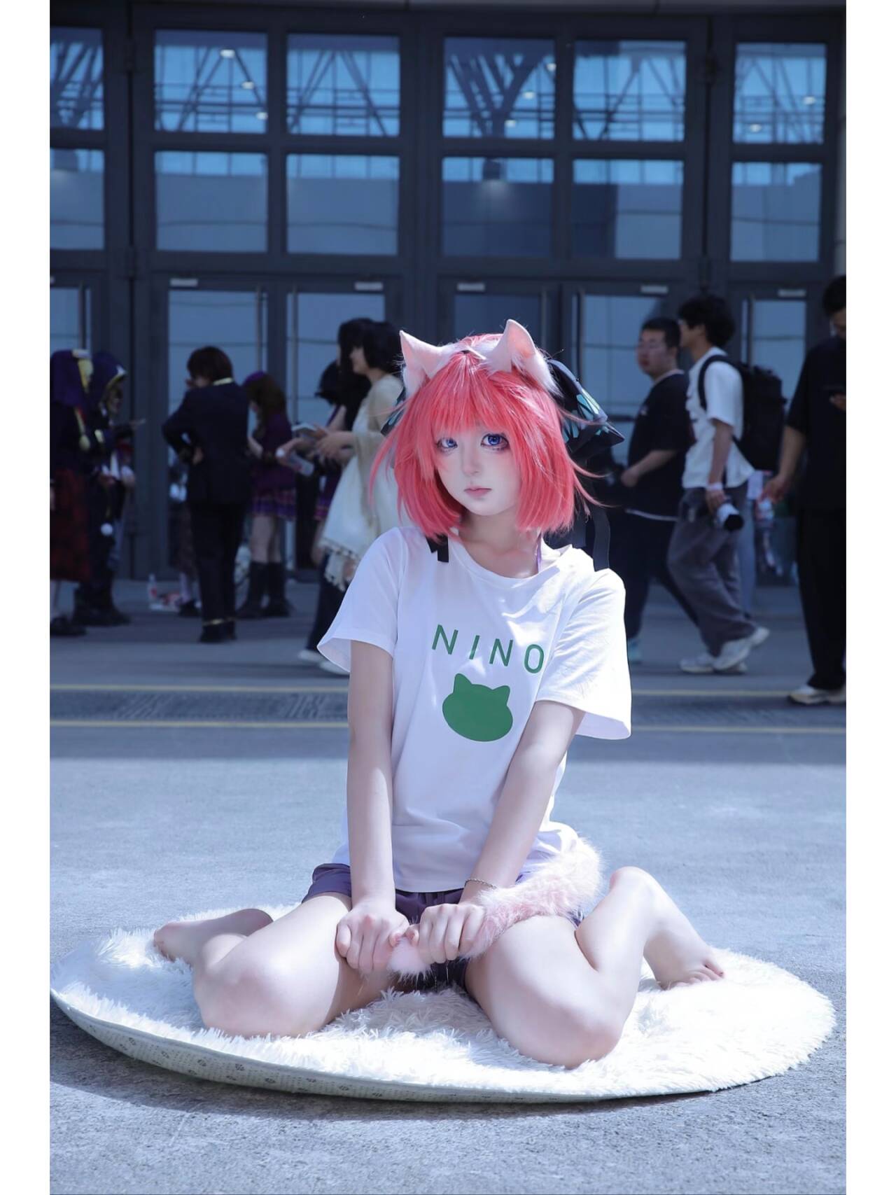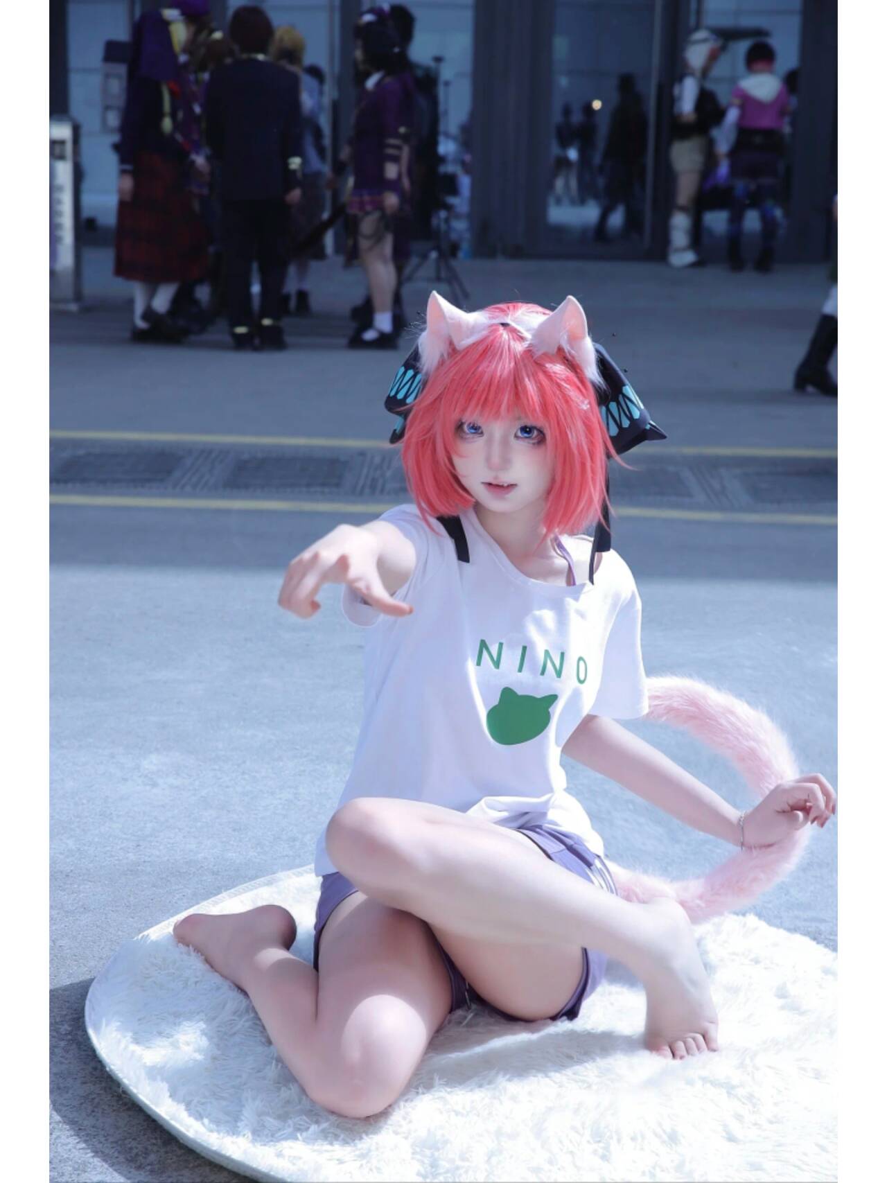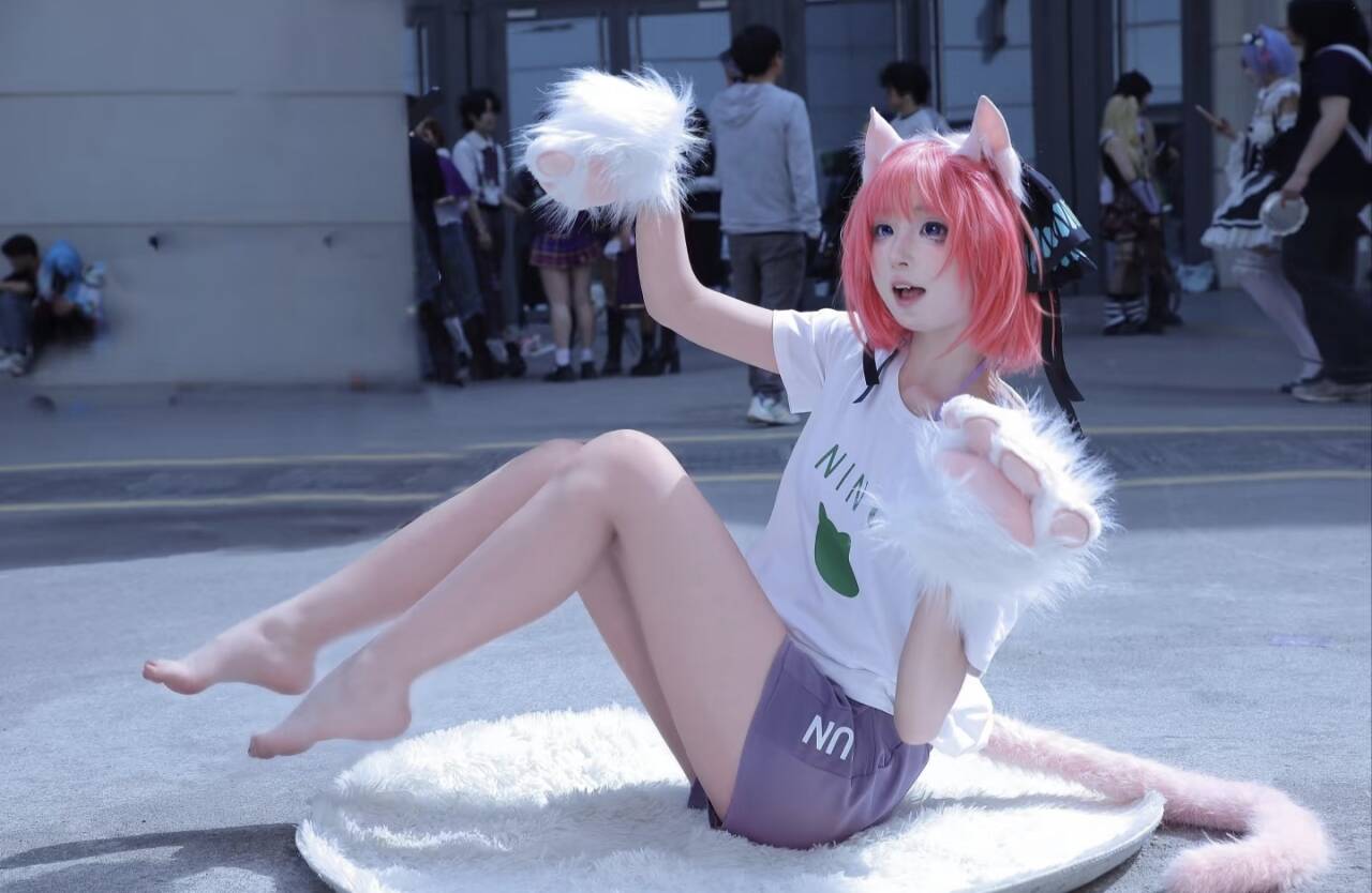 穿着印有“NINO”和小猫图案的白色T恤,搭配浅紫色短裤,简约又不失活力,把二乃私下里的青春感也诠释得恰到好处。她或伸出猫爪,仿佛要朝你扑来;或安静地坐在毛绒垫子上,眼神清澈又带着点小傲娇,每一个姿势都精准踩在“可爱”的点上,仿佛从二次元里走出来的猫咪少女,让现场的漫迷们纷纷驻足,快门声不断。