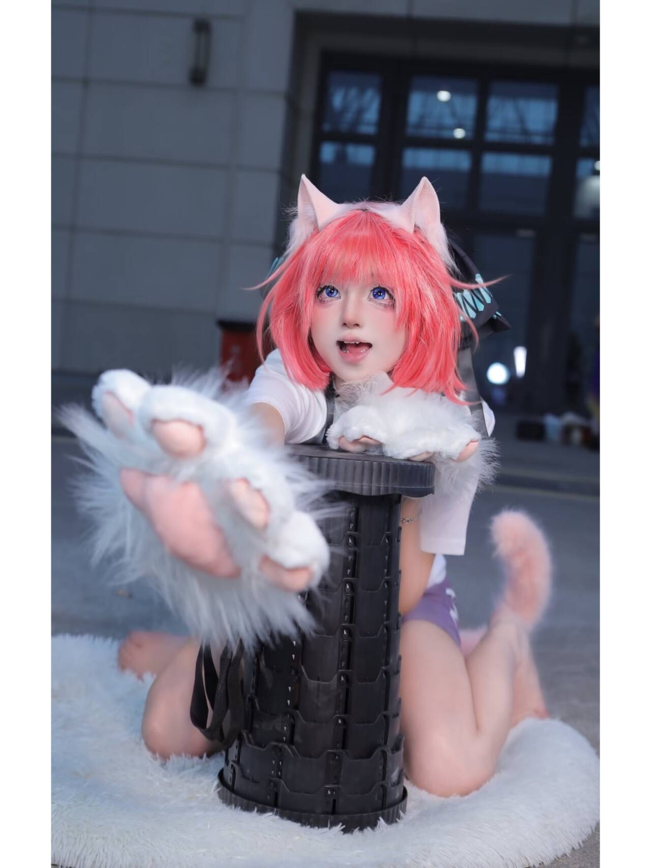粉色短发搭配灵动的猫耳,瞬间让二乃多了份软萌感。那双清澈的眼睛,像是藏着星辰,一眨一眨间,把二乃的娇俏与灵动完美展现。还有那毛茸茸的猫爪和尾巴,更是为整体造型增添了十足的“猫系”氛围,举手投足间,都透着猫咪般的俏皮与慵懒。