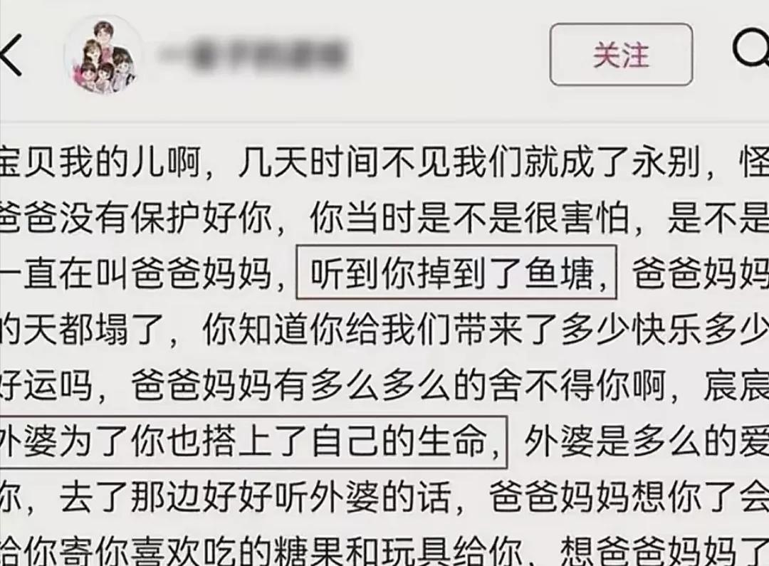 一位父亲在网上泣血发文:不到3岁的小儿子,回老家跟着外婆生活时,在鱼塘边玩耍不慎落水溺亡;不会游泳的外婆,本能地跳下去救人,也没能再上来。两条生命的消逝,让这个家的天,彻底塌了。
