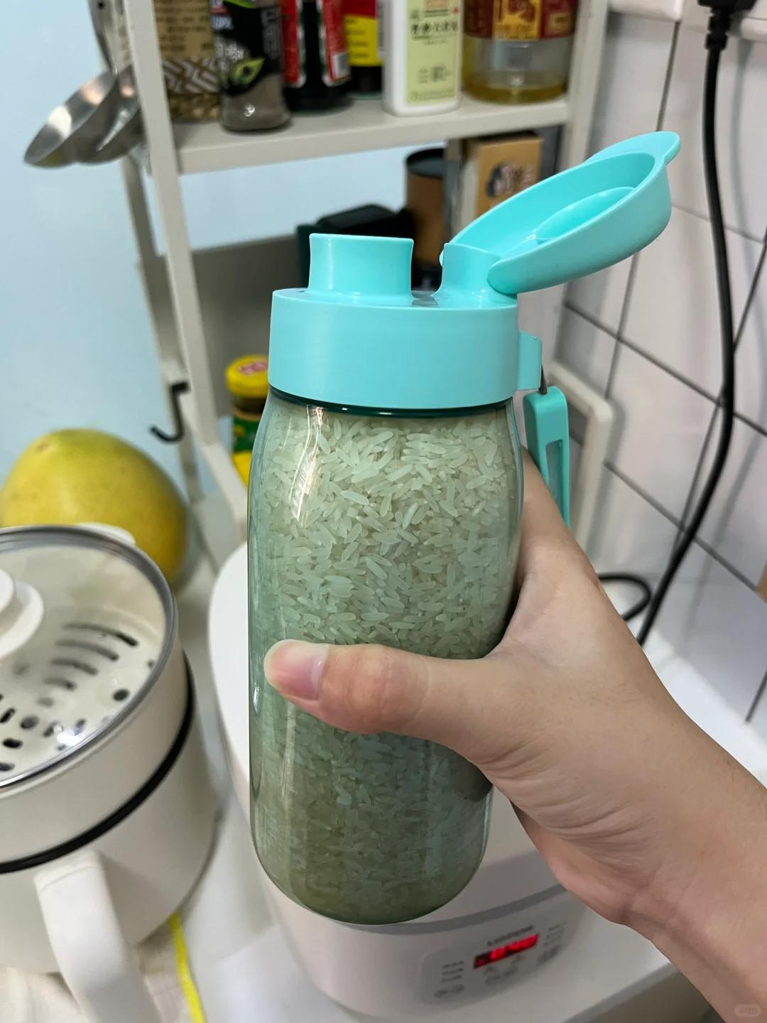 6.厨房装米/调料发现一个不错的收纳办法,家里不用的水杯可以装米,550ml的杯子,能煮饭四五次,打开盖子直接倒,密封性也很不错。