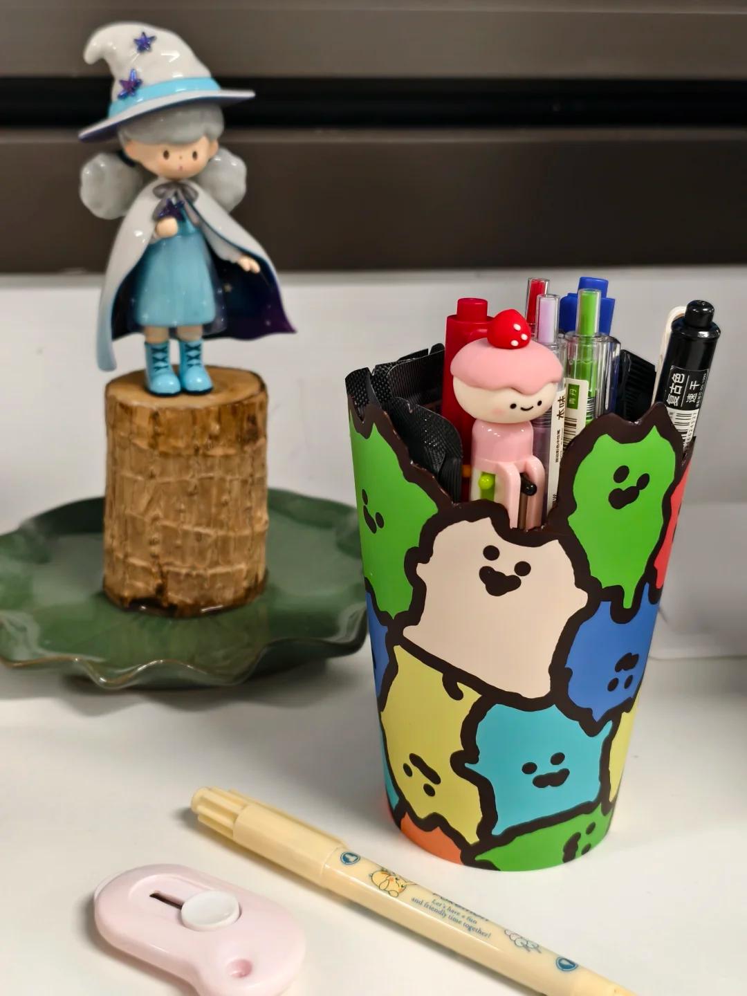 把闲置水杯直接放在桌上,笔、化妆刷、剪刀等放进去都可以,比买的收纳盒还方便。