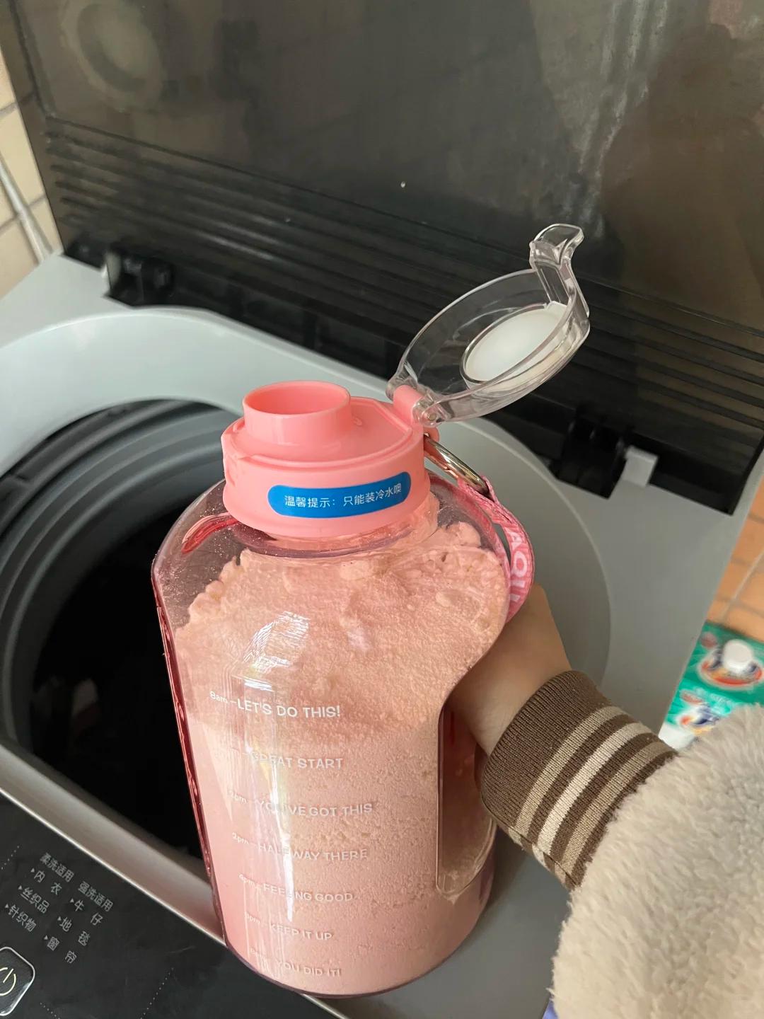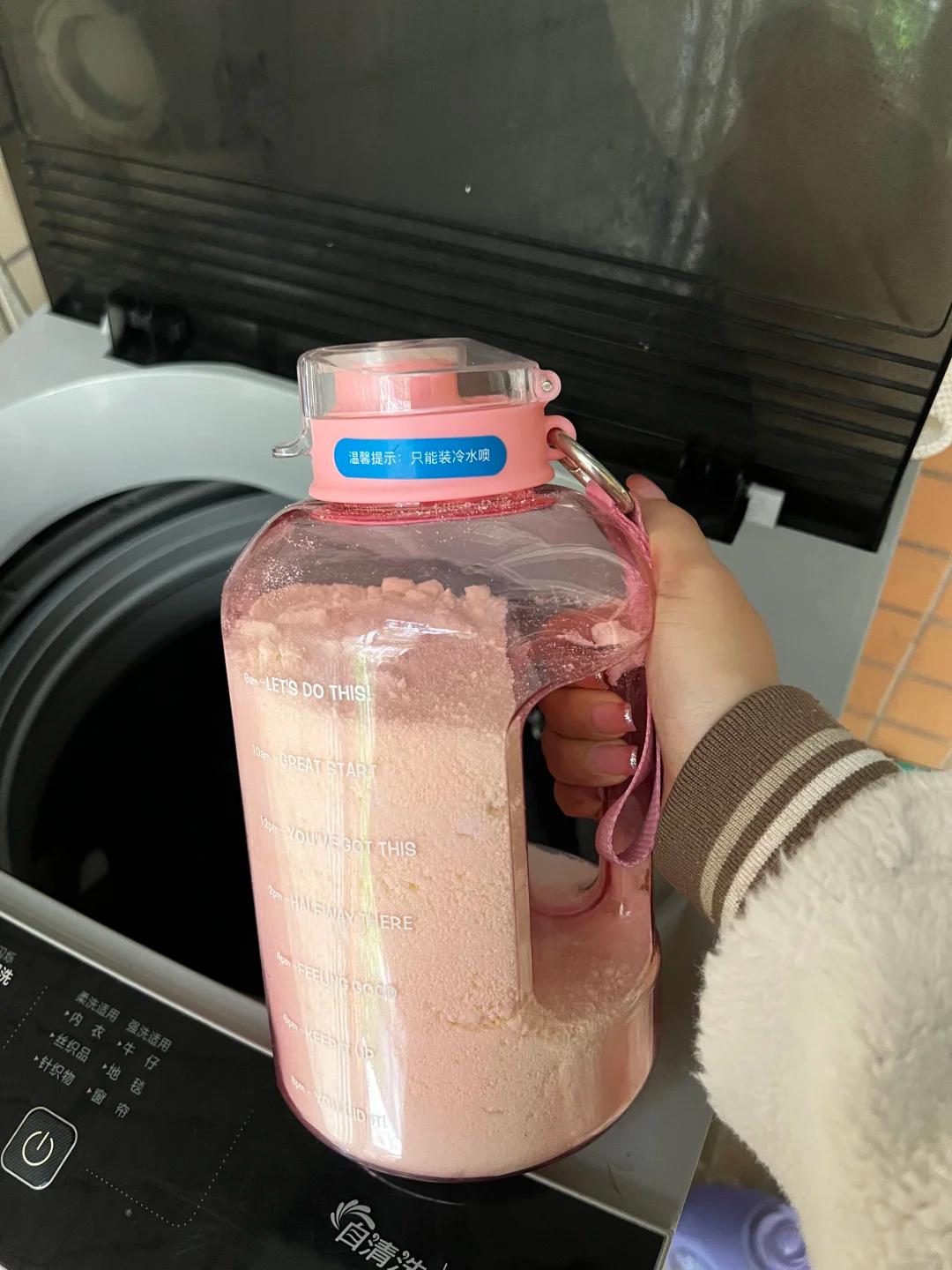 8.装洗衣粉套圈套来的大容量水杯,不敢用来喝水,闲置着一直没用,看到网上疯传的的奶茶杯装洗衣粉,我想那水杯应该也可以,事实证明,很完美。