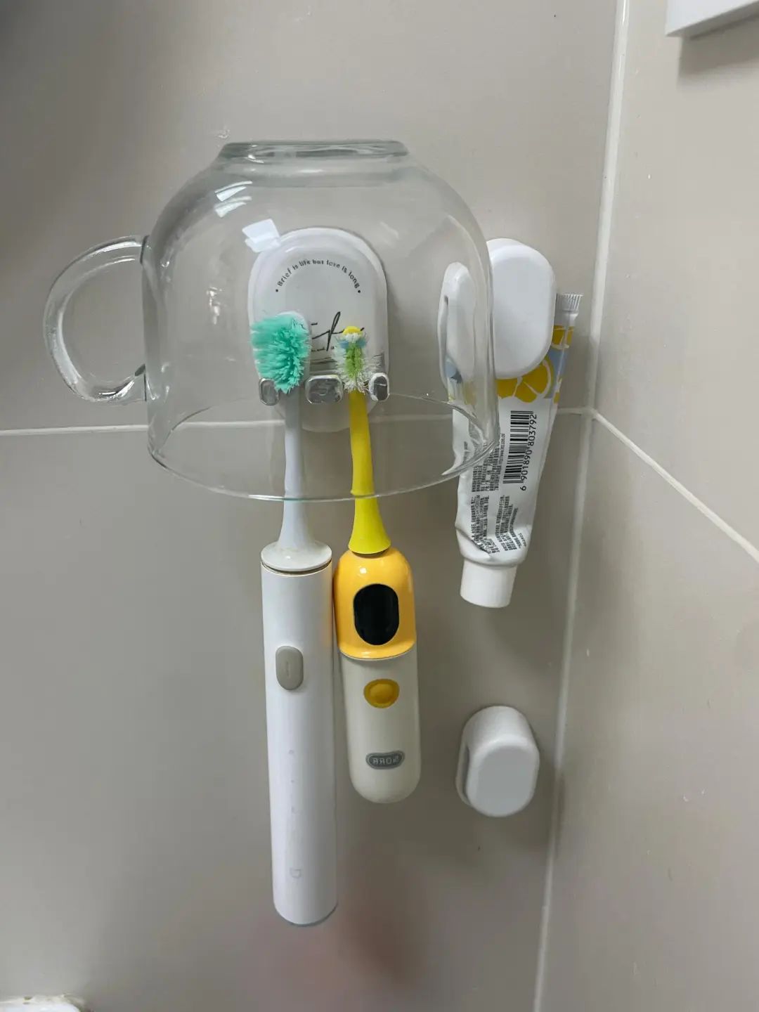 看,喝水杯能直接挂在牙刷架上,匹配度真是绝了。