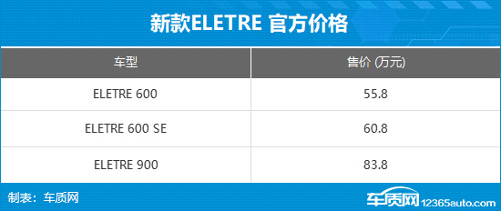 新款莲花跑车ELETRE和EMEYA正式发布并上市。其中,新款ELETRE推出3款车型,售价55.8-83.8万元;新款EMEYA同样推出3款车型,售价53.8-82.8万元。