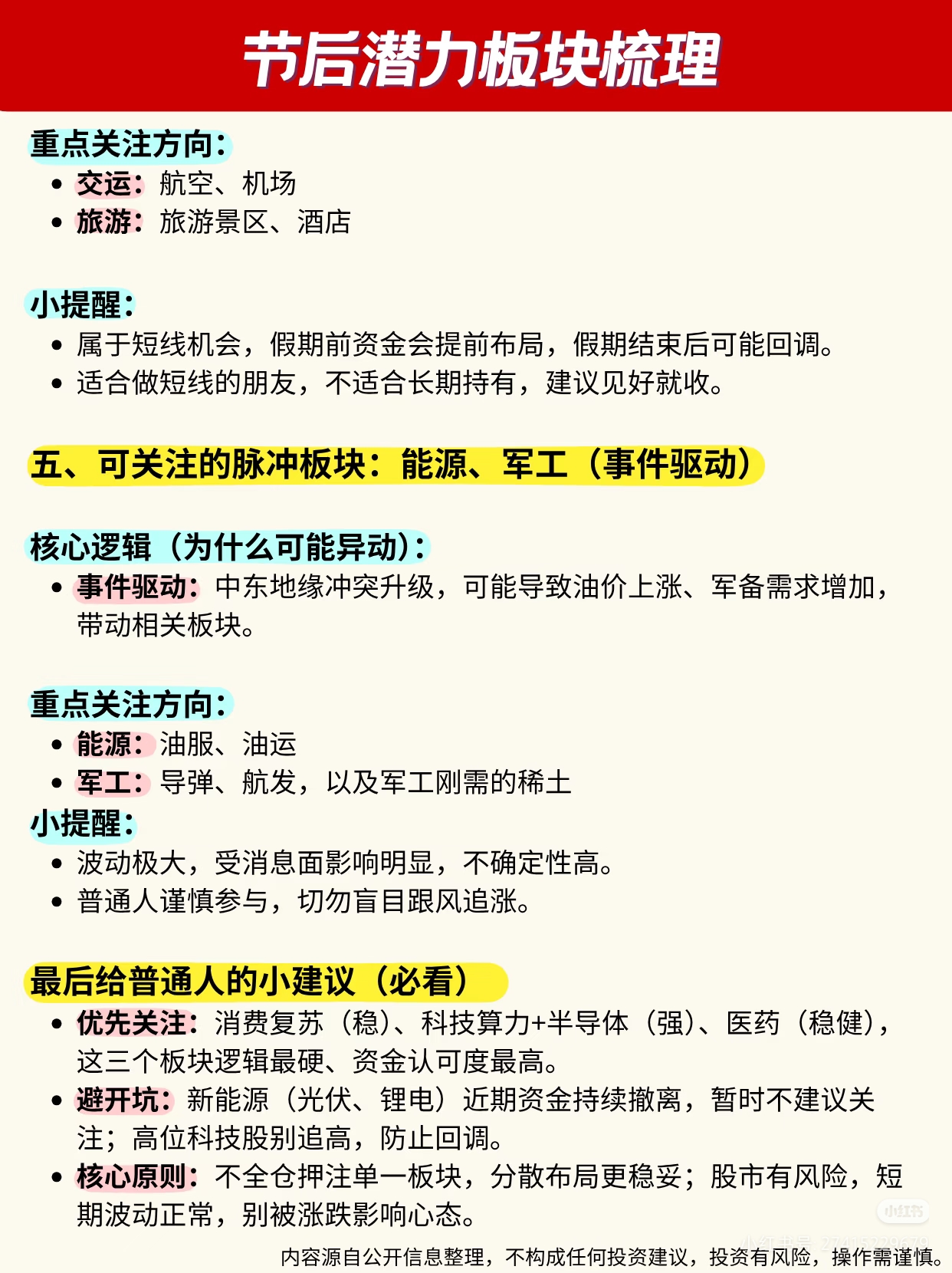 清明小长假催化出行需求集中爆发,航空、机场、景区、酒店直接受益,属于典型事件驱动型短线机会,适合快进快出,假期结束后警惕回调,不建议长期持有。