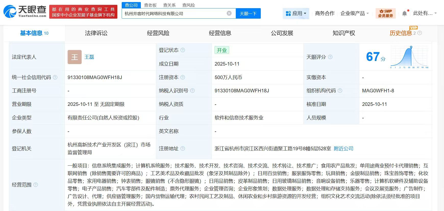 天眼查App显示,近日,杭州井宿时代网络科技有限公司成立,法定代表人为王磊,注册资本500万人民币,经营范围含信息系统集