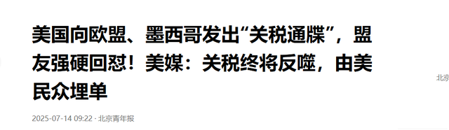 北京青年报——美国向欧盟、墨西哥发出“关税通牒”,盟友强硬回怼!美媒:关税终将反噬,由美民众埋单——2025-07-14