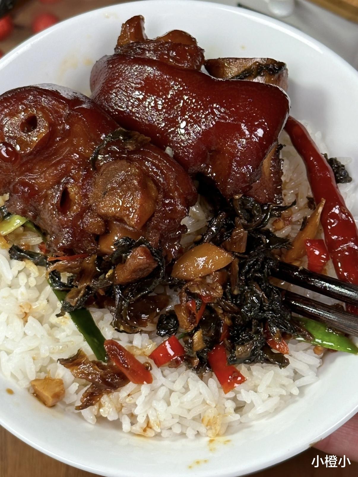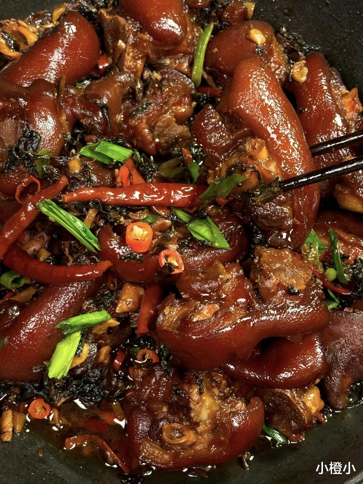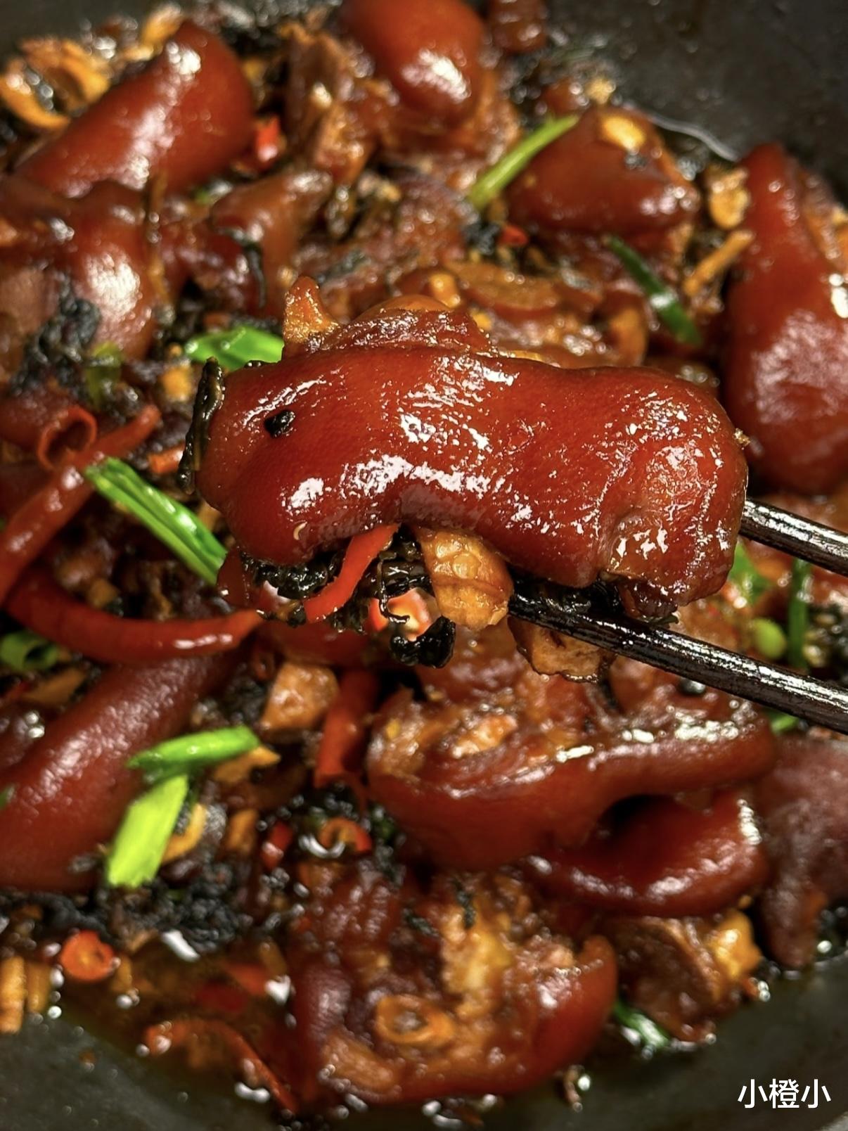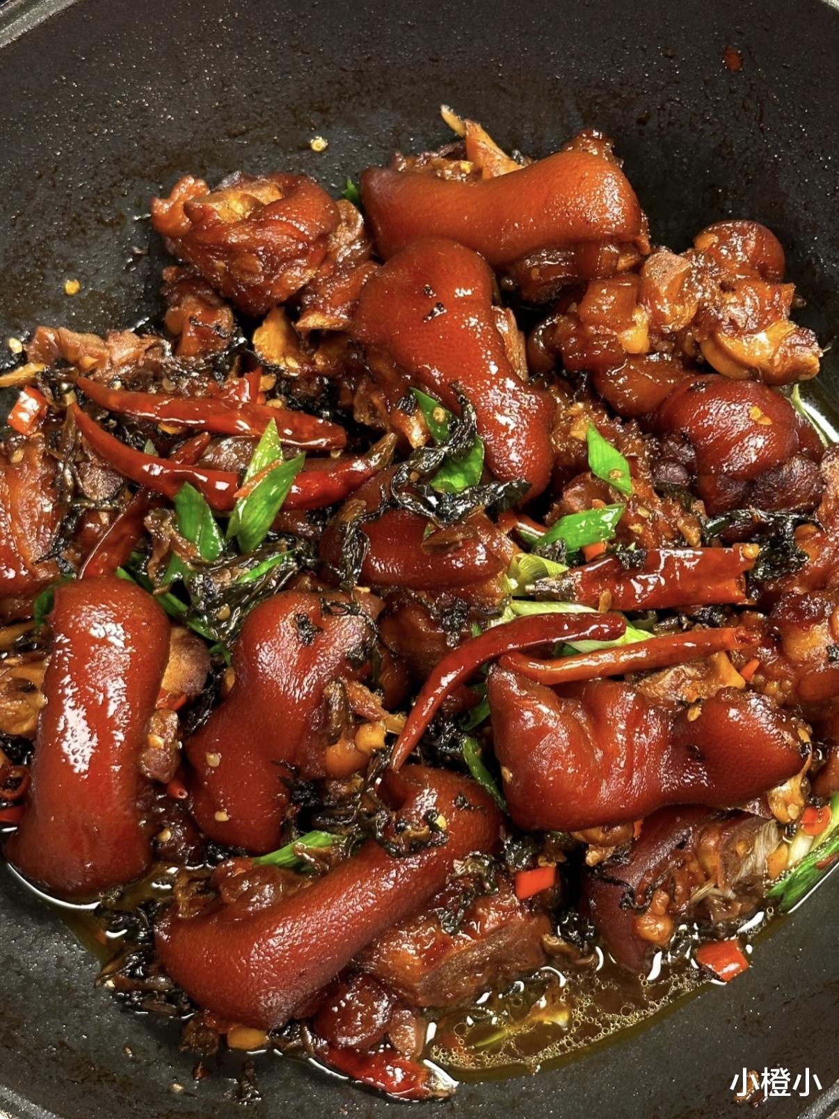40分钟后开盖,汤汁还剩1/3,转大火疯狂翻拌2分钟,汤汁“咕噜咕噜”变粘,梅干菜紧紧扒在猪蹄上,油亮亮像给肉穿了件“焦糖外套”。撒一把蒜叶,锅边再淋半勺香醋,提味又解腻,瞬间升华!