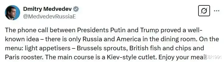 首先,我们需要明白,这场通话并非仅仅是两个大国领导人的例行互动,俄罗斯联邦安全会议副主席梅德韦杰夫在社交媒体上用一种颇具幽默和讽刺意味的方式形容这次会谈:在这个餐厅里,只有俄罗斯和美国是真正的顾客,而欧洲和乌克兰则成了菜单上的“菜品”——欧洲是开胃小菜,而主菜则是乌克兰。