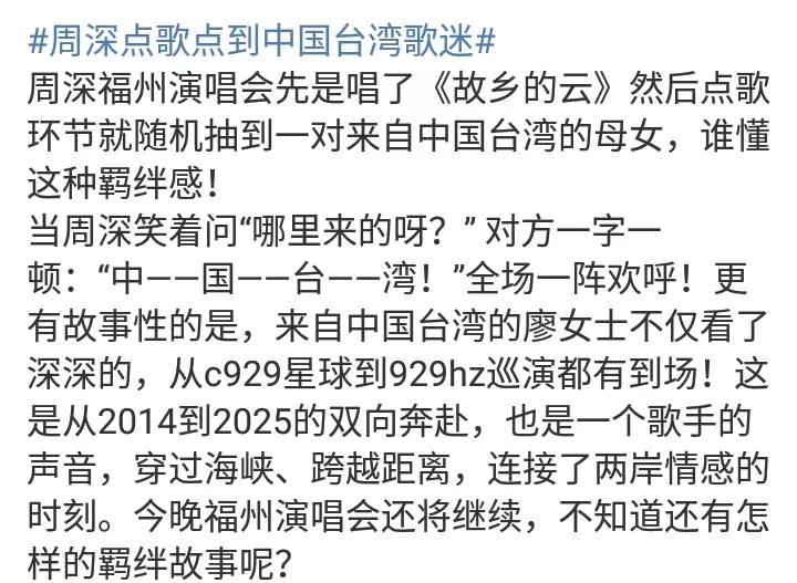 这欢呼声,不仅是对周深魅力的认可,更是对两岸一家亲的深情共鸣。周深的知名度越来越大,早已跨越台湾海峡,在台湾地区也收获了众多忠实的粉丝。对此,“周深点歌点到中国台湾歌迷”消息,引发内地网友的共鸣!