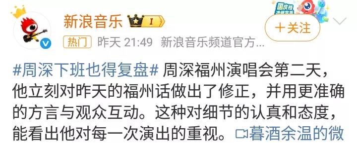 尤其是当歌手周深高歌一曲后,他高兴地用福州方言,与舞台之下的歌迷互动交流,令人回味无穷!就在这个过程中,周深因发音的结果,带来演唱会的欢喜氛围。这就是歌手的观众情怀,总是能够用特别的方式给观众带来惊喜与感动,从而给这个温暖的秋天增加喜庆氛围!