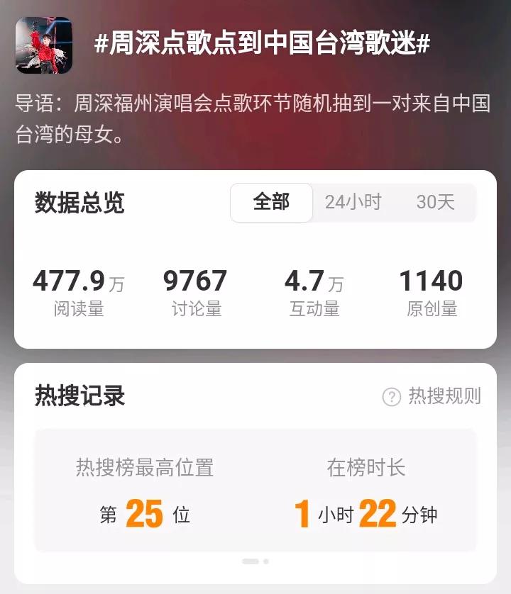 这一话题登上热搜榜第25位,话题阅读量达到477.9万,互动量4.7万,讨论量9767。网友们好评歌手周深,这是一位中国歌手的成功所在!毕竟,在周深举行福州演唱会的时候,有太多的惊喜出现!而歌手周深的把握也非常好!
