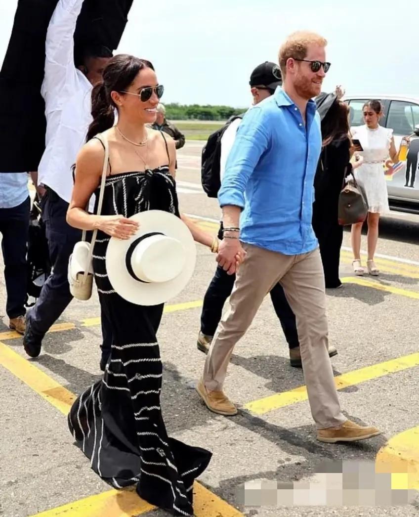 夫妻俩这次的穿搭都很低调,哈里一件黑色polo衫,头戴黑色棒球帽。