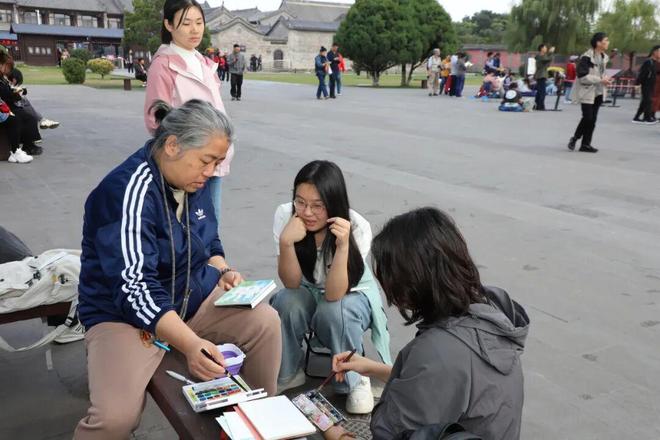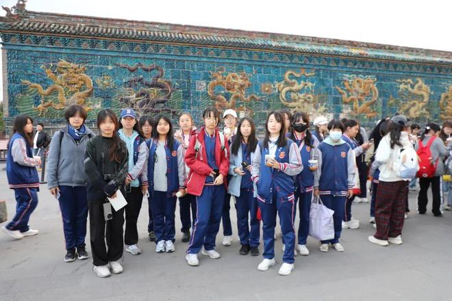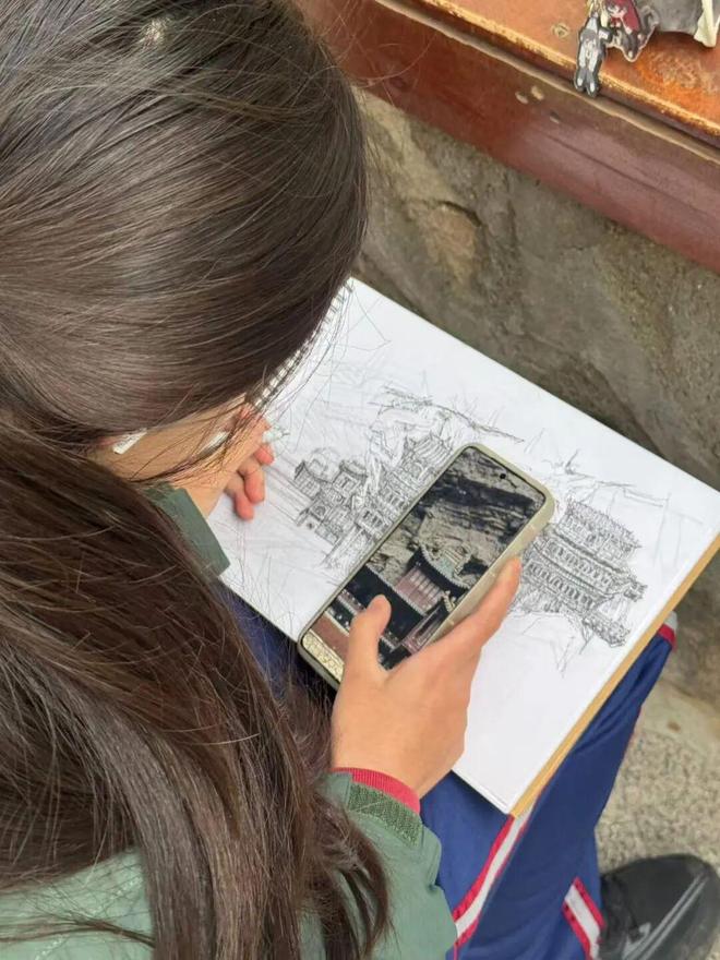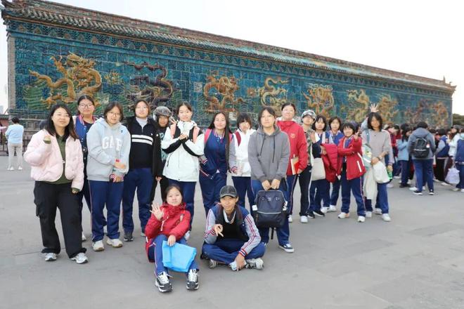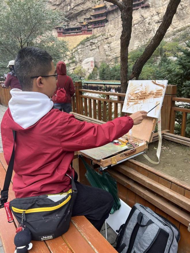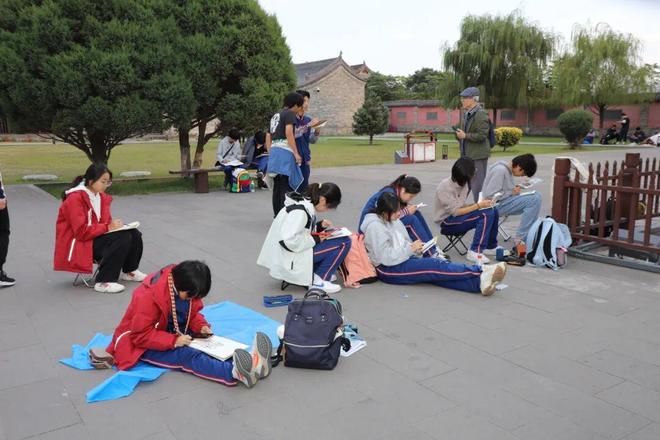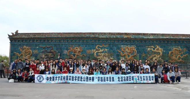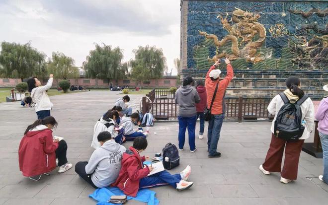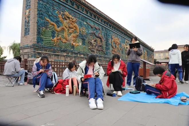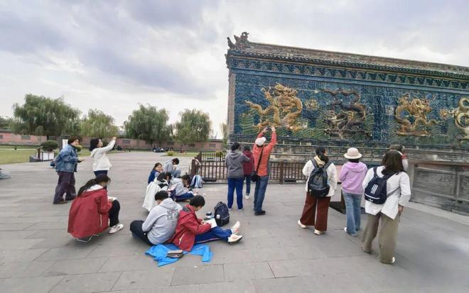 随后,同学们前往大同九龙壁——明太祖第十三子代王府邸照壁。这里不仅是明代建筑艺术的瑰宝,更是中国龙文化的重要载体,其恢弘气势与精妙工艺令人叹为观止。它通体用五彩琉璃砌成,九条巨龙形态各异,腾跃于云海之间,色彩绚丽且历经数百年不褪色。壁面还饰有山石、水草等图案,细节丰富。其建筑艺术和琉璃工艺堪称明代巅峰之作,具有极高的历史与艺术价值。在这里,同学们纷纷用画笔记录这精美的画面,用色彩描绘这壮观的景色。