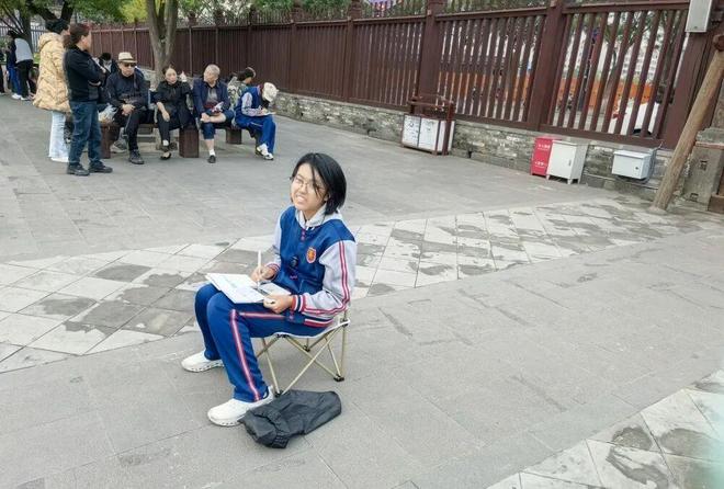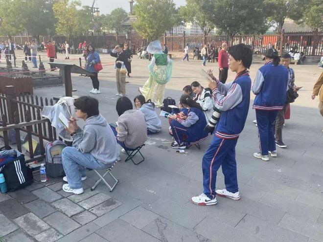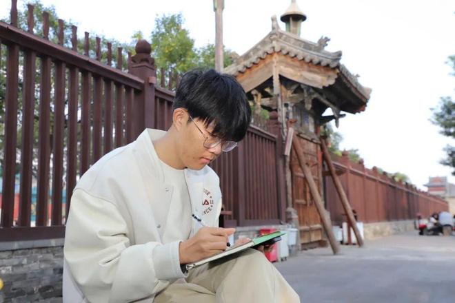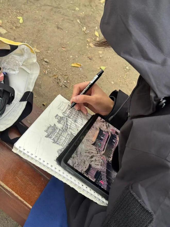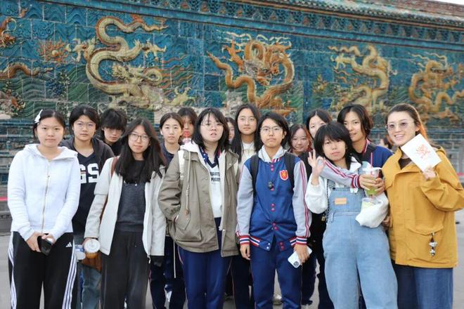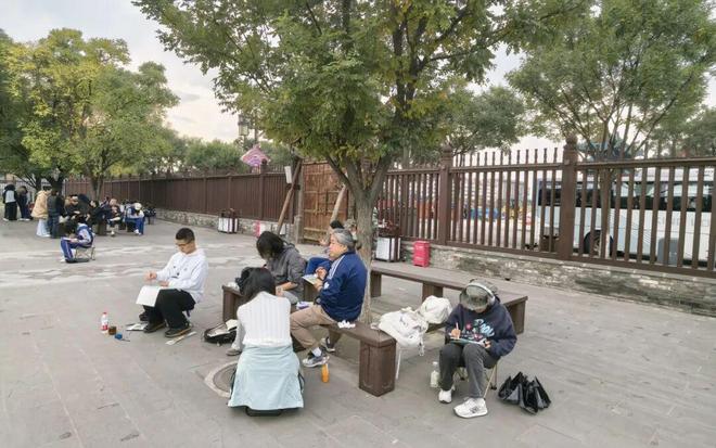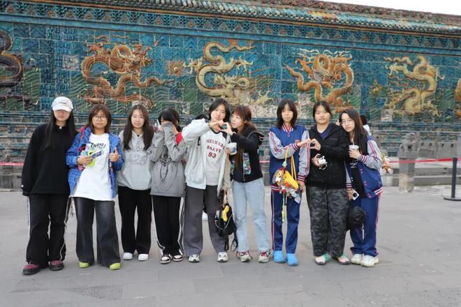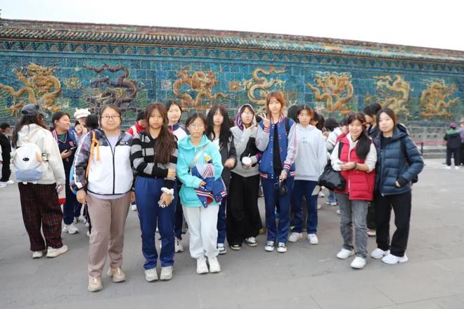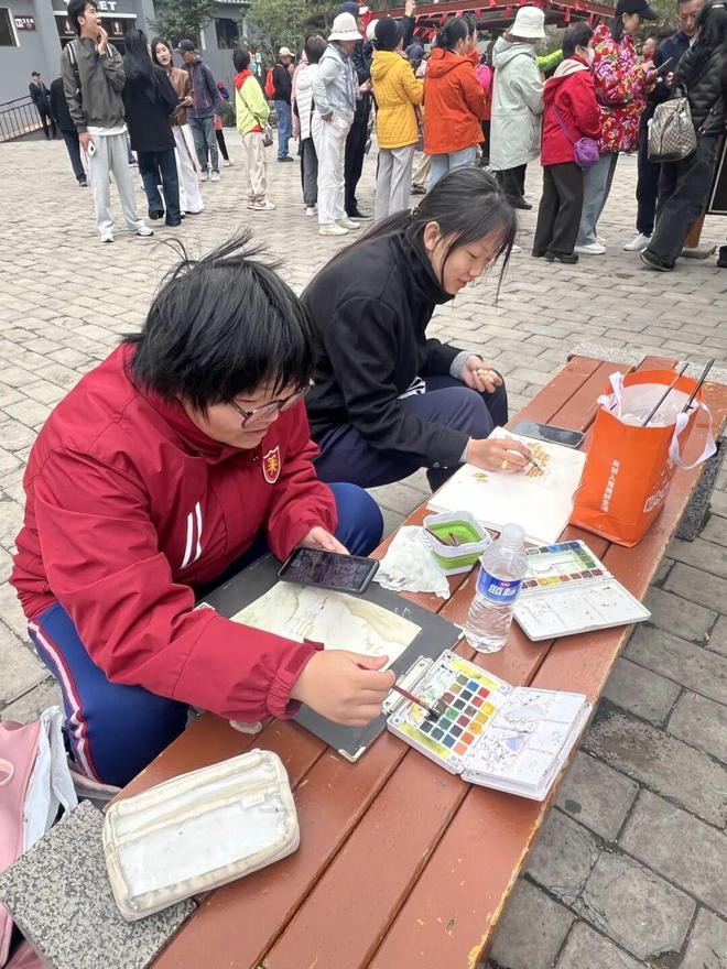 随后,同学们前往大同九龙壁——明太祖第十三子代王府邸照壁。这里不仅是明代建筑艺术的瑰宝,更是中国龙文化的重要载体,其恢弘气势与精妙工艺令人叹为观止。它通体用五彩琉璃砌成,九条巨龙形态各异,腾跃于云海之间,色彩绚丽且历经数百年不褪色。壁面还饰有山石、水草等图案,细节丰富。其建筑艺术和琉璃工艺堪称明代巅峰之作,具有极高的历史与艺术价值。在这里,同学们纷纷用画笔记录这精美的画面,用色彩描绘这壮观的景色。