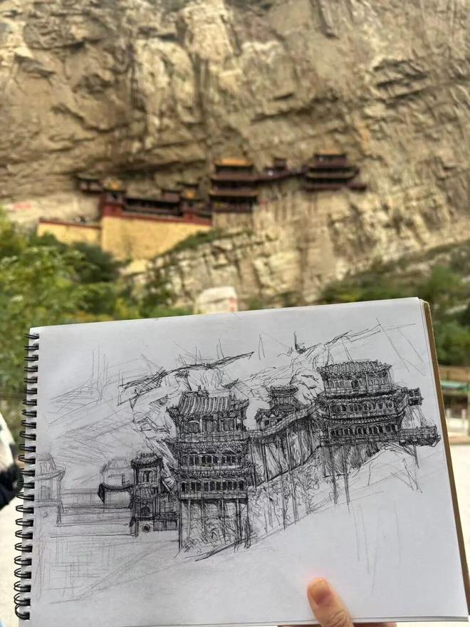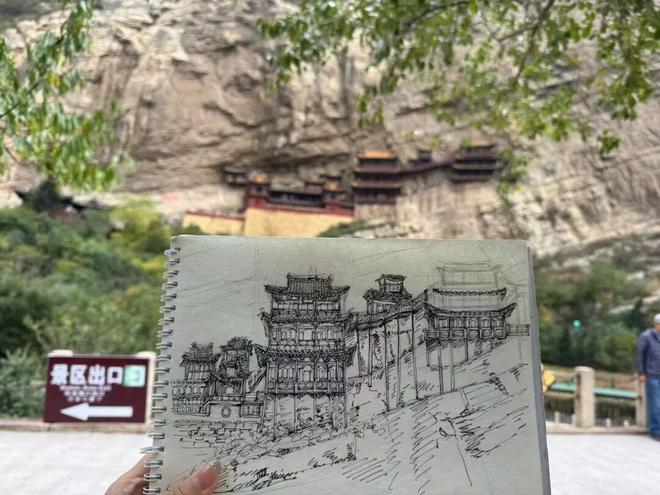 10月16日,大家集体出发去往悬空寺。此时灰色的云层盖过大地,大家看到两边的高楼平房逐渐消失,直到只剩零星一点,在雾霭笼罩的远方,依稀可以看到连绵不绝的群山:这意味着大家已经离开热闹的城镇,即将驶向那远离尘嚣,在历史文化中现形的一方天地。