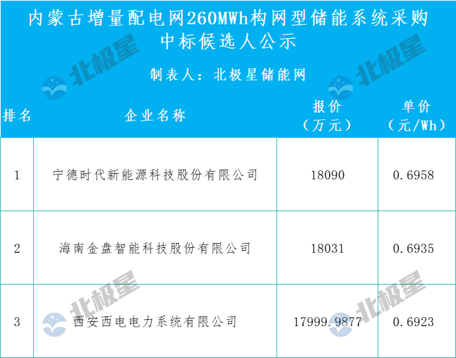 第二中标候选人为海南金盘智能科技股份有限公司,投标报价18031万元,折合单价0.6935元/Wh;