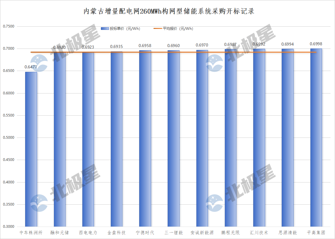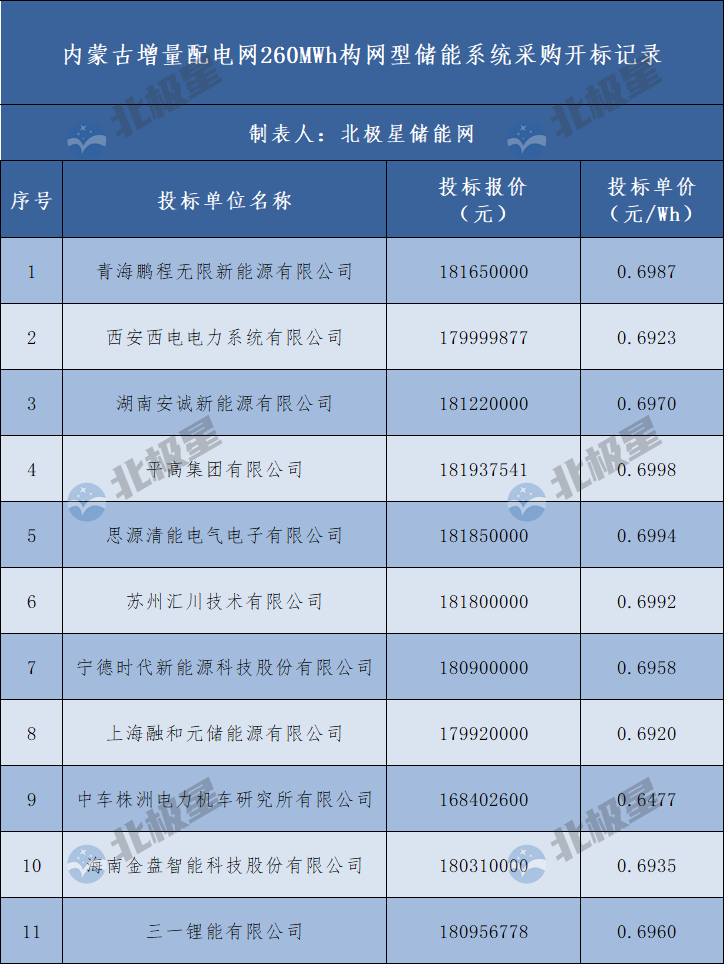 根据项目开标记录,共有鹏程无限、西电电力、安诚新能源、平高集团、思源清能、汇川技术、宁德时代、融和元储、中车株洲所、金盘科技、三一锂能11家企业参与竞标,投标单价范围为0.6477-0.6998元/Wh,平均报价0.6919元/Wh。