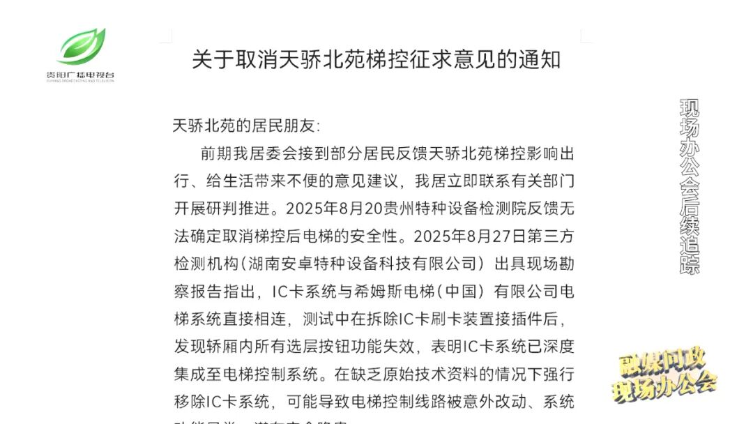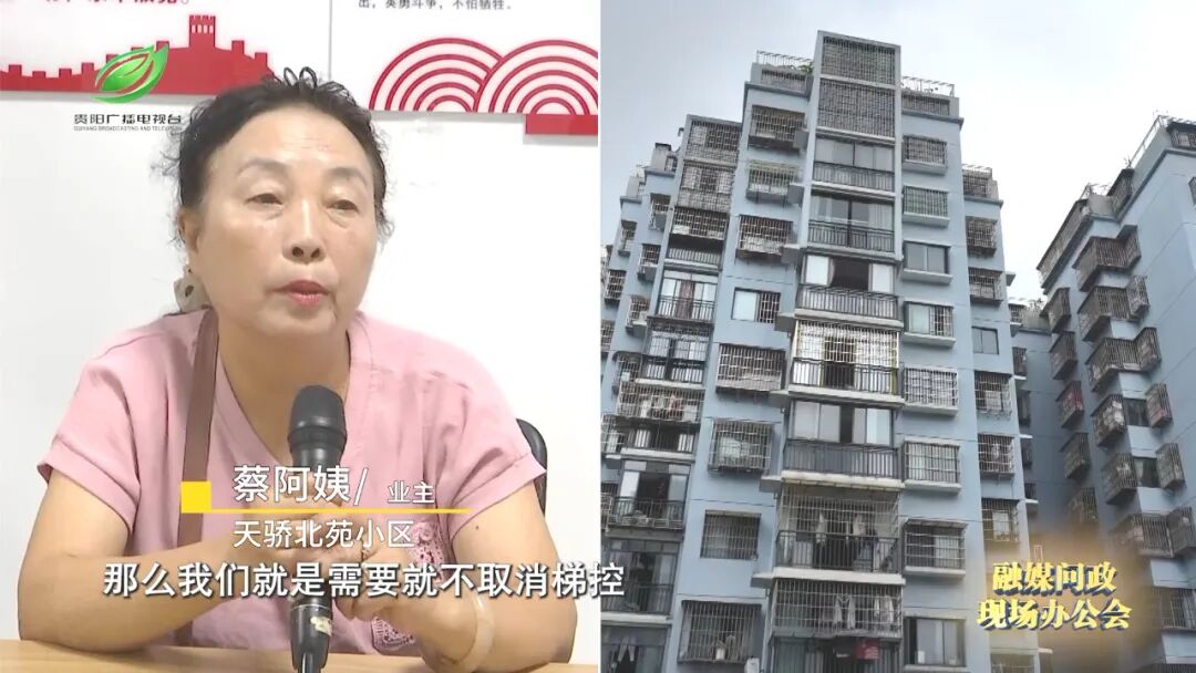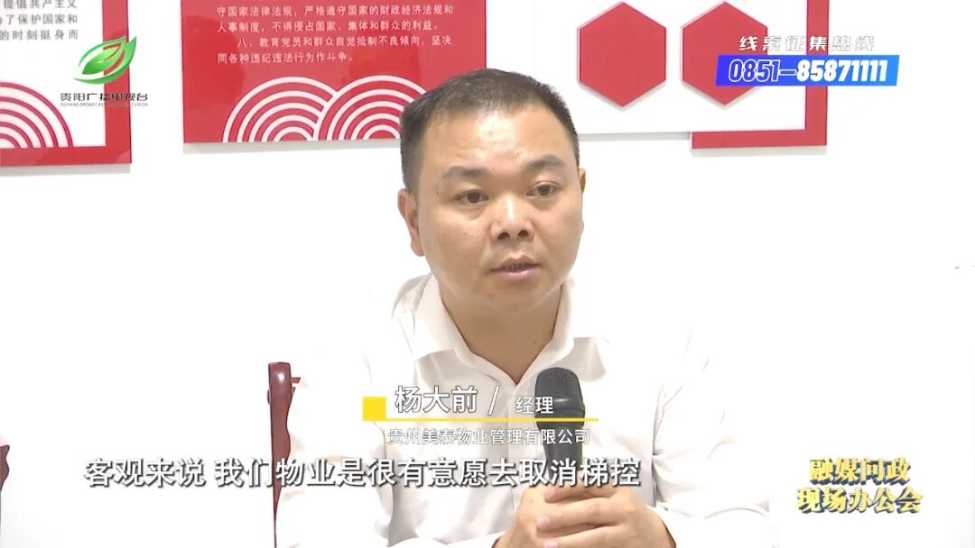 贵州美泰物业管理有限公司经理 杨大前:一是如果梯控拆除以后,对电梯的使用没有任何风险,肯定是无条件拆除;二是从现场管理来说,我们肯定也要尊重整个小区所有业主的意愿,针对上次民意调查,我在小区里面也有了解,有不同的呼声,所以我建议如果有相关的资料支撑,我们能去做一个甄别。