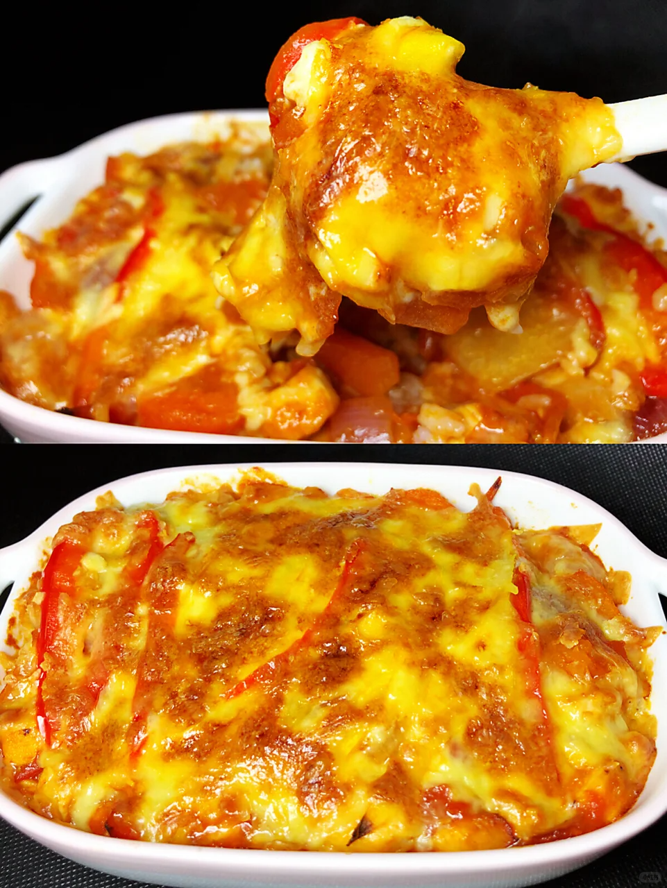 烘烤:预热烤箱至200度,将焗盘放入烤箱中层,焗烤约20分钟或直到芝士完全融化并呈现金黄色斑点。