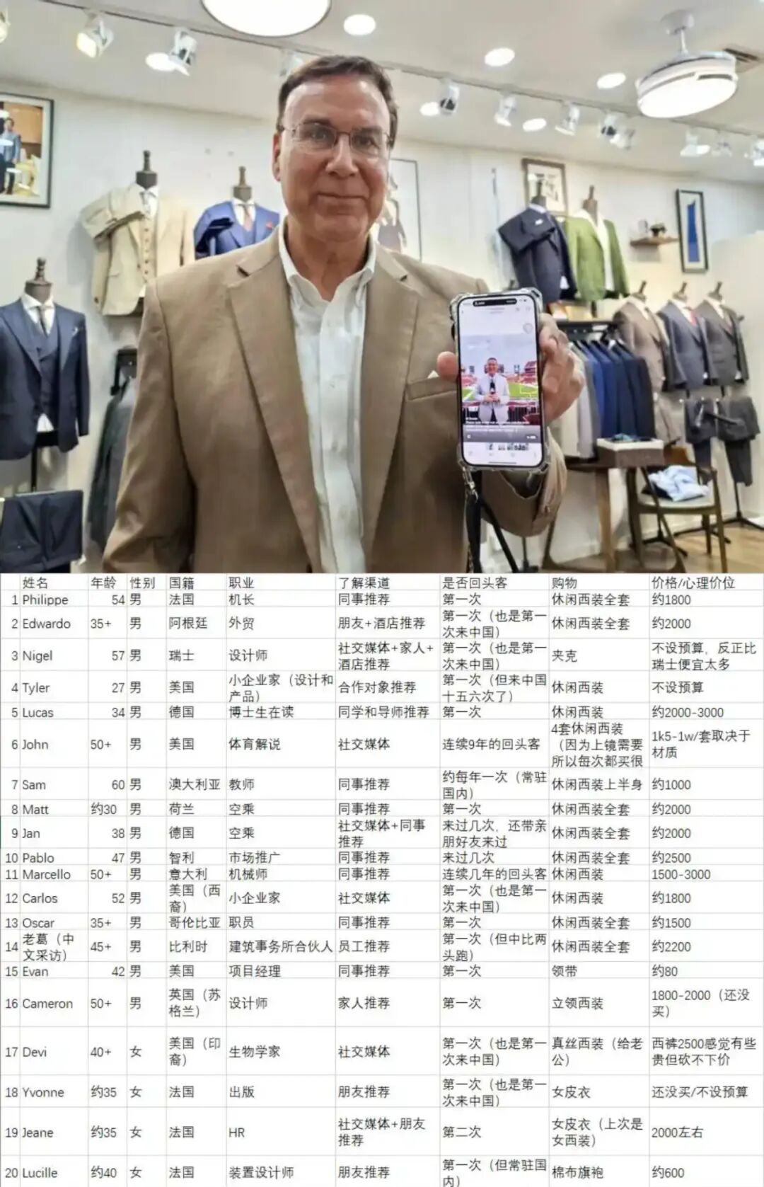下图:20位消费者的基本情况表,其中一位John举着他在橄榄球场边报道时穿着Susan定制的西装的照片(图源:澎湃研究所)