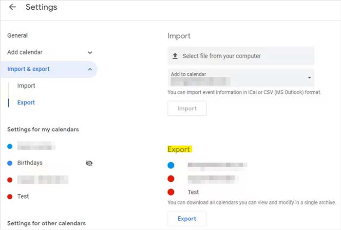 或者,您可以通过选择“设置” > “导入和导出” > “导出”从 Google 日历手动导出日历。