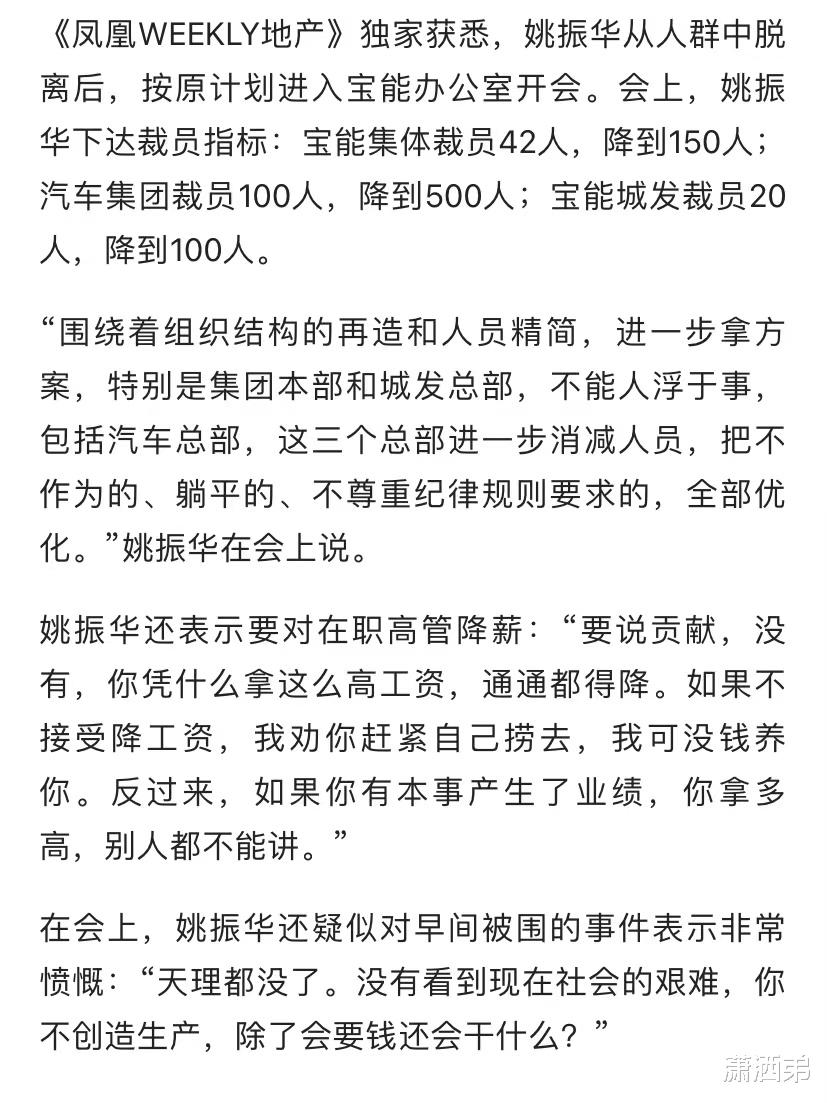 根据《凤凰网》独家报道,姚振华逃脱之后,按照原计划进入了办公室召开裁员会议。这一次,宝能集体裁员42人,汽车集团裁员100人,宝能城发裁员20人,一共是裁员了162人。