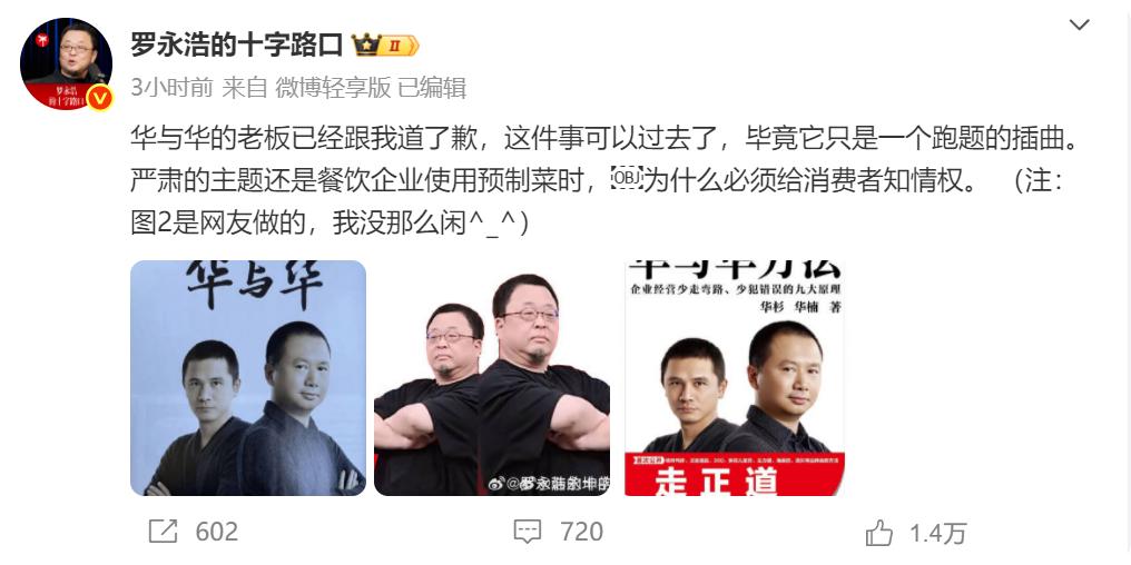 9月15日,罗永浩发文称华与华老板向其道歉。西贝也发出了更有诚意的道歉信,但罗永浩却在微博发文称,“顾客虐你什么了?顾客都被你打成网络黑社会了,谁虐谁呢? 百分之百没有预制菜的虚假承诺呢? 拿预制菜假装不是预制菜的税率差异呢,要不要给公众摊开讲讲?”
