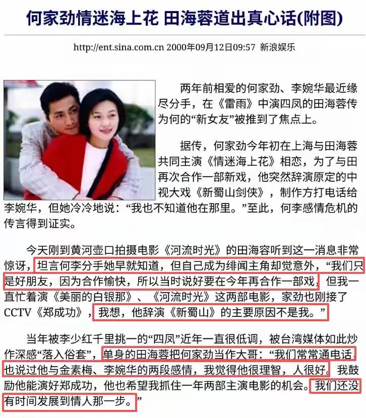1999年毕业季,同龄人挤破头跑剧组递简历,她却火速注册了自己的影视公司。一年后,公司数量涨到三家,首部制片作品《情迷海上花》爆火全国。这部剧还让她和“展昭”何家劲传了绯闻。彼时何家劲有正牌女友李婉华,港媒疯传两人因田海蓉分手,可她一句“我们只是好朋友,没到情人那一步”,四两拨千斤地把绯闻变成了剧集热度,也让圈里人见识了她的“公关智慧”。
