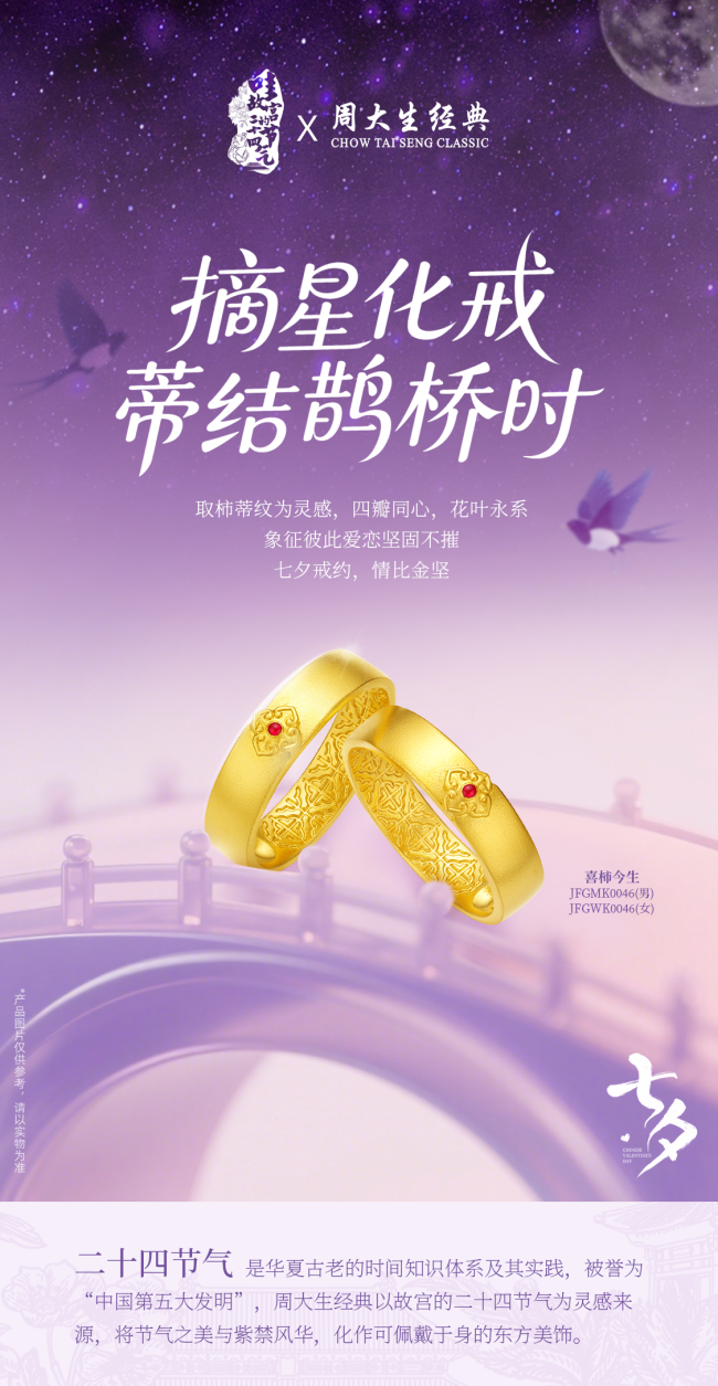 在寿康宫的柿子树上,累累硕果缀满枝头。柿子与“事”字谐音,寓意着事事如意,而柿蒂纹则承载着喜事连连的美好祝愿。周大生经典“哇!故宫的二十四节气”系列“喜柿今生”,以柿蒂纹为设计灵感,四瓣花形同心相连,花叶永系,象征恋人间坚不可摧的爱恋。“喜柿今生”采用高精密度油压模工艺与CNC高浮雕工艺精心打造,通过标准化设备成型,确保产品版型精准、图案立体生动。古法珐琅工艺的应用,亦为“喜柿今生”注入独特的艺术魅力。在七夕这个洋溢着浪漫气息的节日里,“喜柿今生”不仅承载着二十节气非遗文化的内涵,更象征对爱情的祝福。愿每对恋人都能像柿子一样,蒂结出幸福永恒的爱情果实。