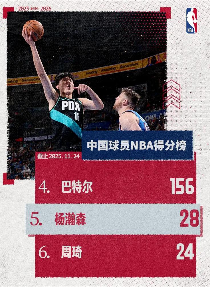 数据不会说谎:杨瀚森此役出战17分36秒,投篮11中3,砍下8分4篮板3助攻,上场时间和出手数均创生涯新高。更重要的是,他的NBA总得分已达28分,正式超越周琦的24分,升至中国球员历史得分榜第五位,仅次于姚明、易建联、王治郅和巴特尔。