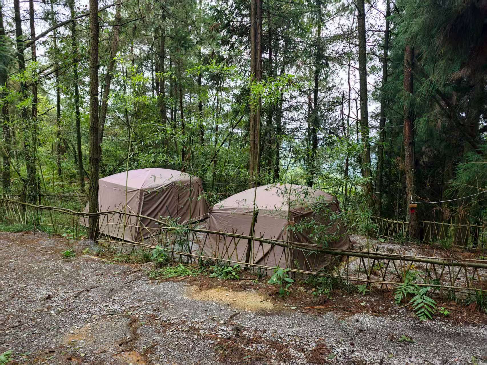 二、森林营地,时间的慢放键行至林间开阔处,几顶棕褐色的帐篷静静 “卧” 在砾石地面上,这便是森林营地的核心所在。帐篷被简易竹篱圈起,竹枝的青涩与帐篷布料的沉郁色调相融,毫无违和地嵌入森林背景里。没有炫目的霓虹灯,没有坚硬的水泥墙,营地的一切都保持着山野本真:帐篷角落沾着青苔痕迹,空地上偶尔有松鼠蹦跳着衔走松果,远处林梢间,云雾似的山岚正缓缓流动。