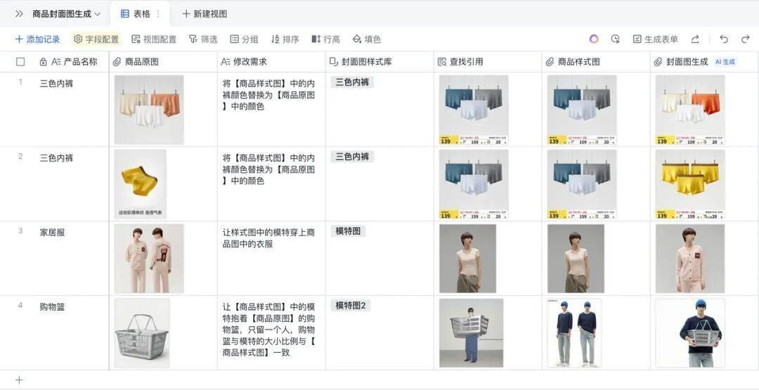 利用AI生图能力,以往从提出需求到设计落地至少需要两天的流程,被多维表格与AI缩减到了分钟级,且整个过程不再需要设计岗的参与,运营人员都可以通过自然语言做出媲美专业设计的商品图片。