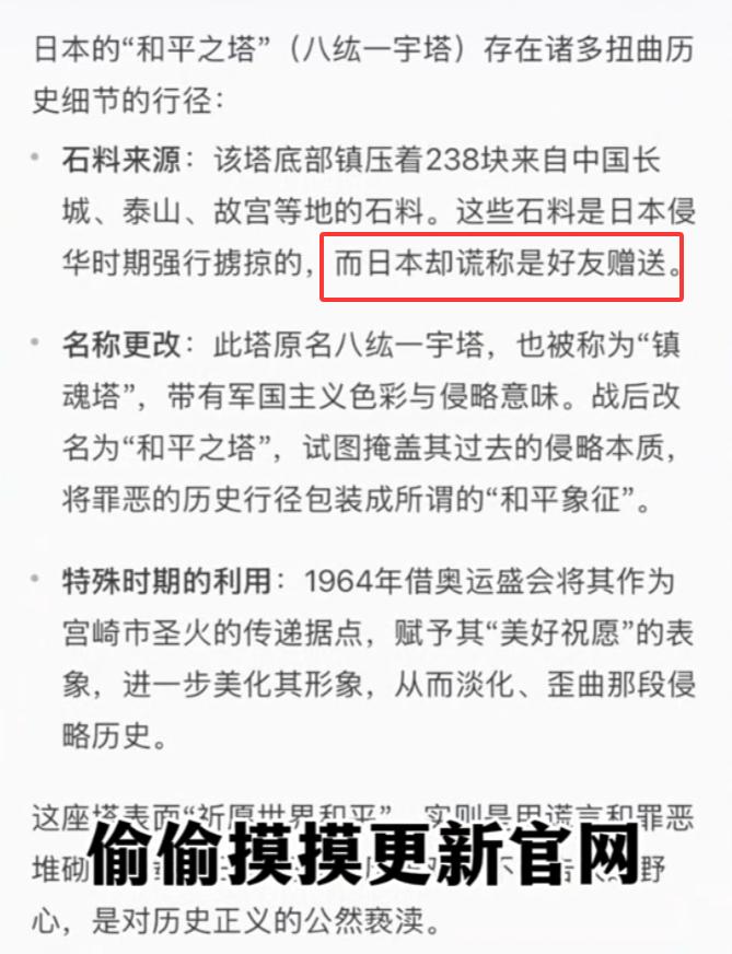 事情的起因很简单,宫崎县有一座著名的“地标建筑”,现在叫“和平之塔”。这塔基座上嵌着从世界各地弄来的石头,为了配合“和平”的人设,官网现在的口径变得极其温良恭俭让,声称这些石材是“来自友好国家的馈赠”,是“祈愿和平的基石”。这套“记忆消失术”玩得那是相当溜,仿佛只要网页上的字改了,当年的强盗逻辑就能变成邻里和睦的佳话。