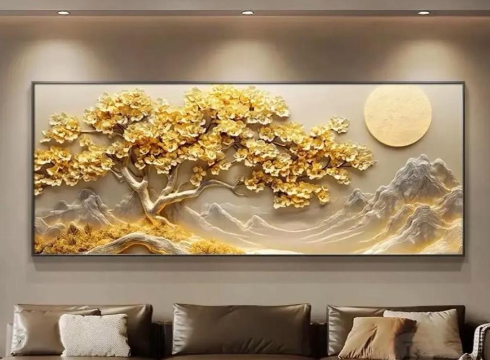 这类画作保留了吉祥寓意,又避免了传统山水的“压制感”,适合放在客厅东侧(非窗户直射区域)或北侧墙面,尤其适合中老年人居住的家庭。