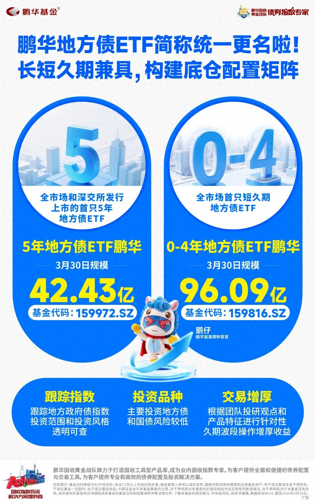 3月31日,鹏华基金固收团队旗下两只地方债ETF的场内扩位简称完成更名,统一采用“投资标的核心要素+ ETF+鹏华”的命名结构,进一步强化管理人品牌识别度。具体更名情况如下: